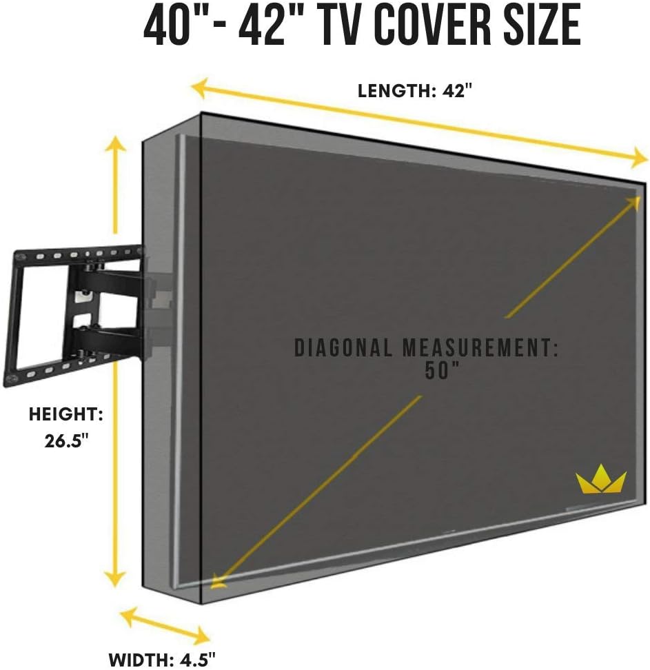 OUTDOOR TV COVER SIZE FIT – 42” W x 26.5” H x 4.5” D, designed for flat screen TV and displays. Compatible with television models 48-inch to 50-inch TV model. The size gives allowance to cover tv stand, digibox and sound bar. Measure your TV to ensure compatibility with the outdoor TV cover