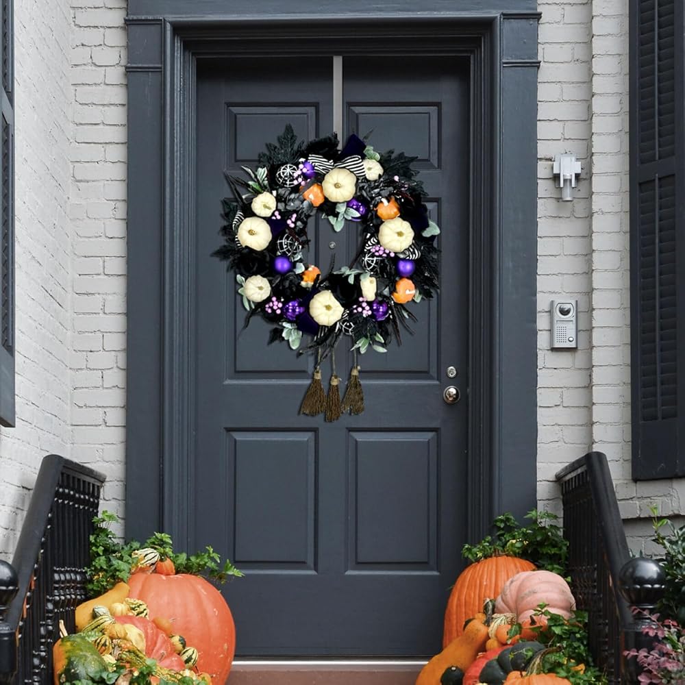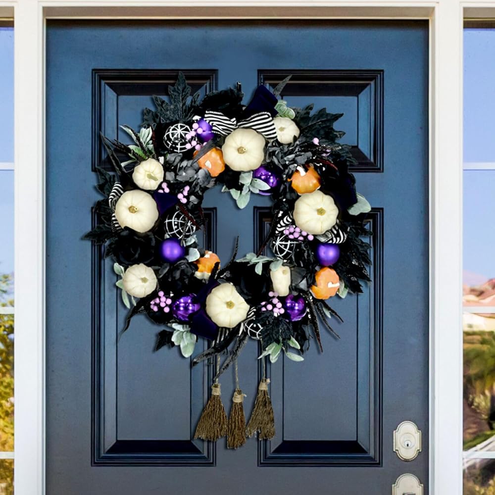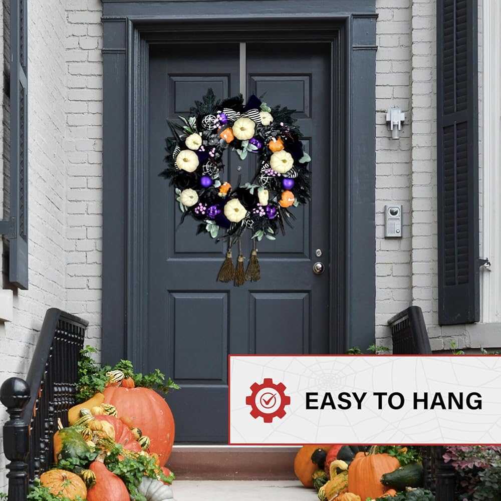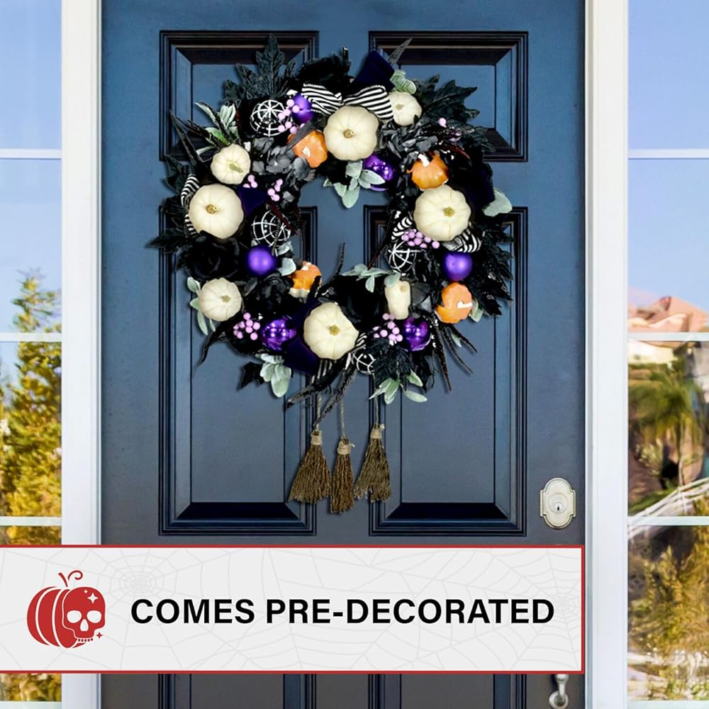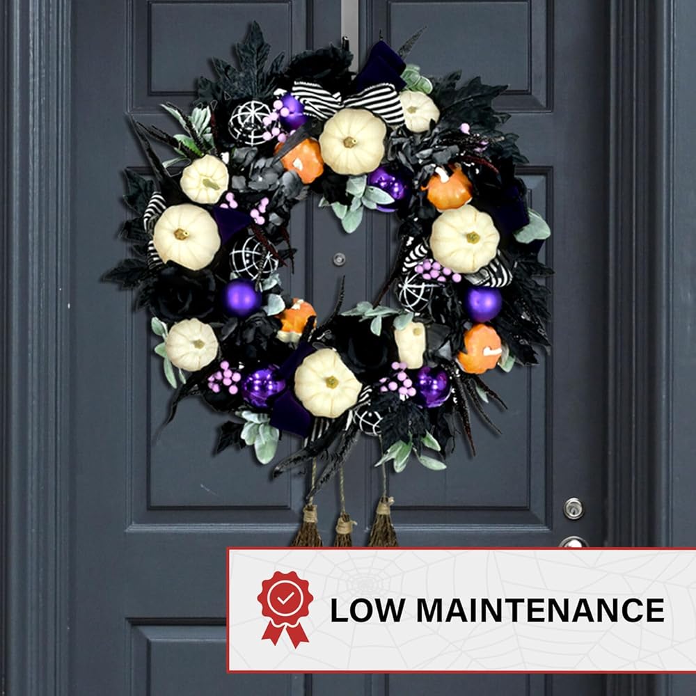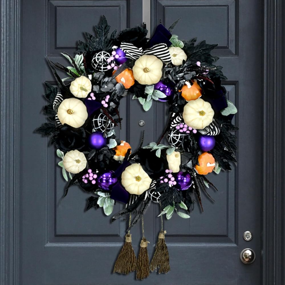 No Assembly Required: Your new wreath of assorted black leaves, orange and white pumpkins, purple baubles, and mini brooms will complete your haunted house, helping you welcome the spooky season