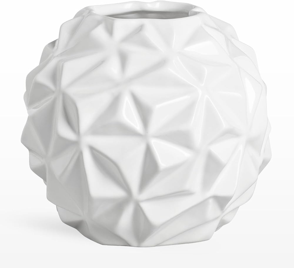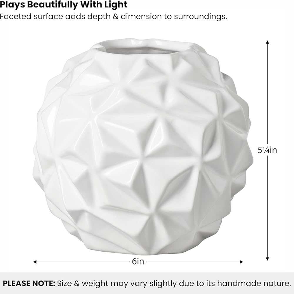 GEOMETRIC VASES FOR DECOR: The Crumple Faceted Ball Vase is a handmade round ceramic vase with raised asymmetrical pyramid textures and a high-gloss white finish. This modern white home decor small white vase measures 6"Dx5.25"H and is designed to hold flower arrangements or add visual interest to any room as a white decorative bowl