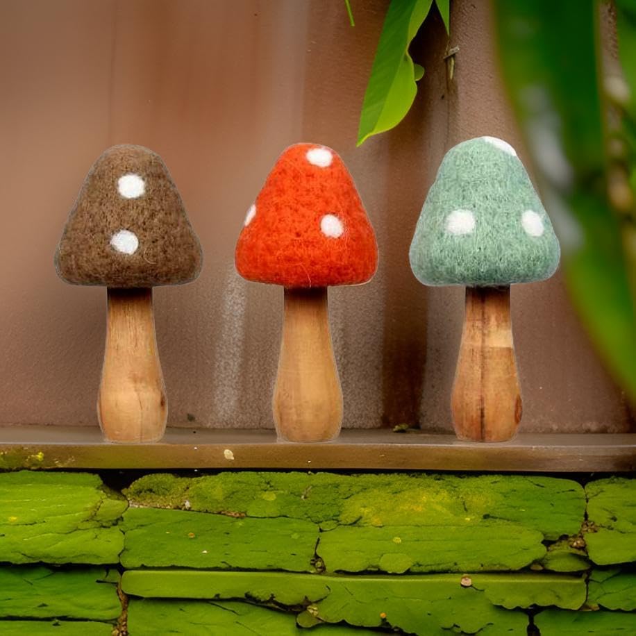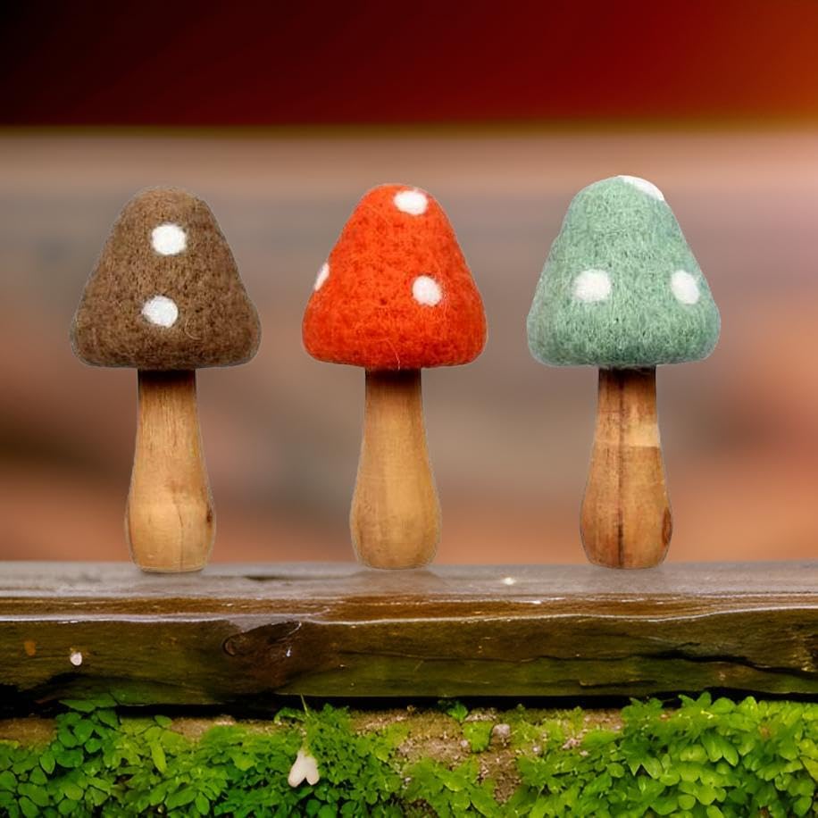 Hiqh Quality Construction: This colorful toadstool set of 3 figurines is crafted from wool and wood for a sturdy and long lasting accent piece.