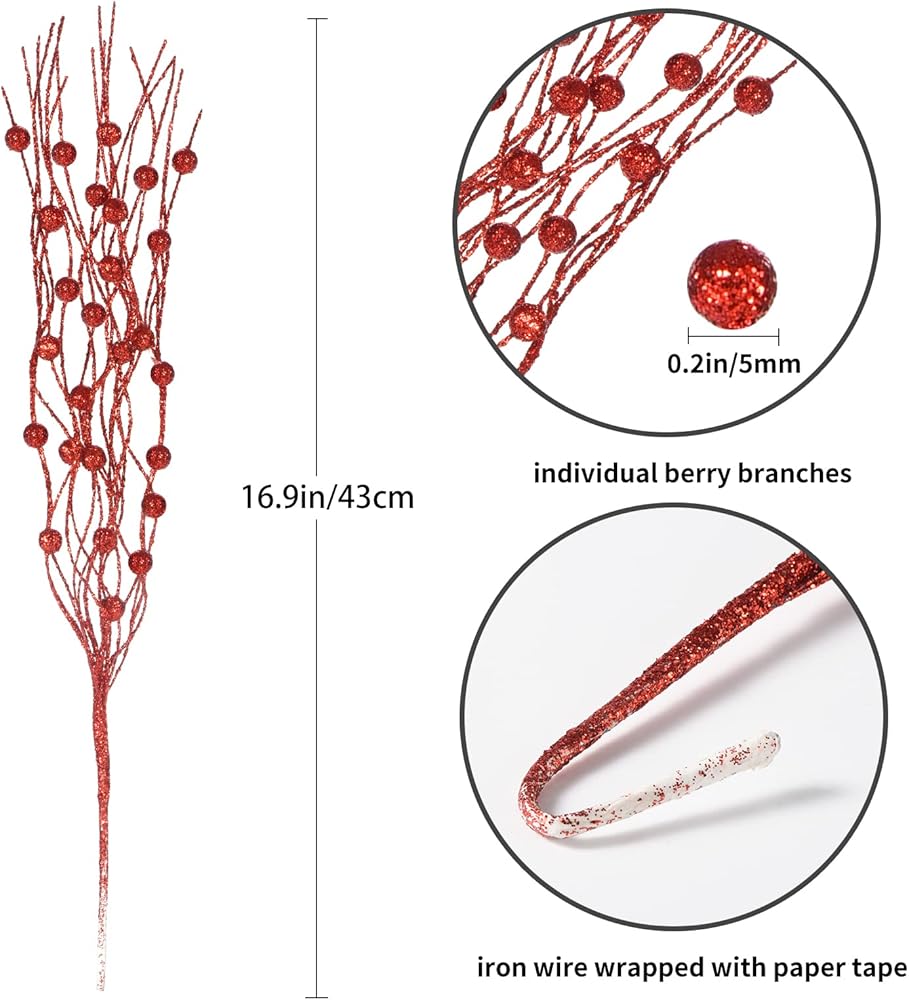 Size: The christmas decorative glitter sticks is 17inch/43cm in length. The main stem is about 7inch/18cm long. The diameter of the fruit is 0.2in/5mm.