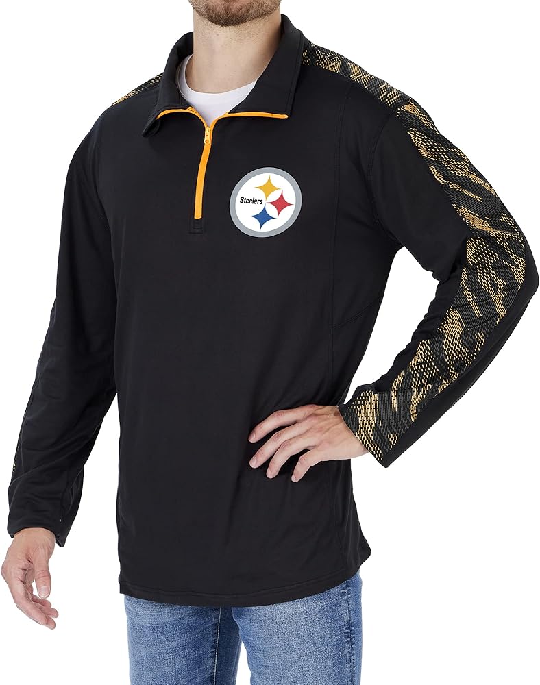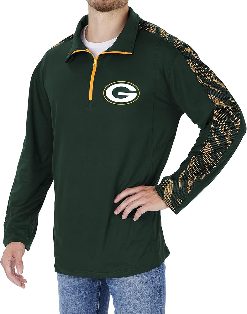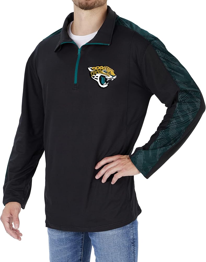 - Quarter zip, team color viper print accents, NFL team logo, Poly/Spandex