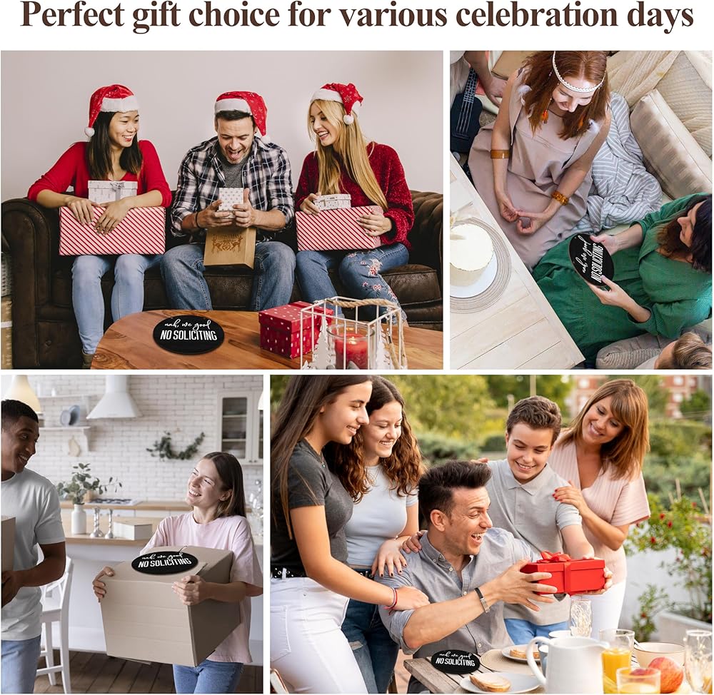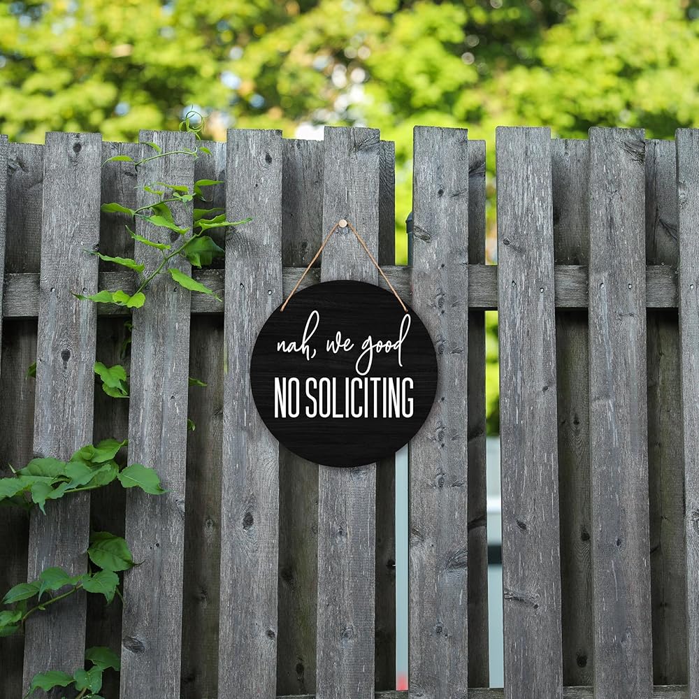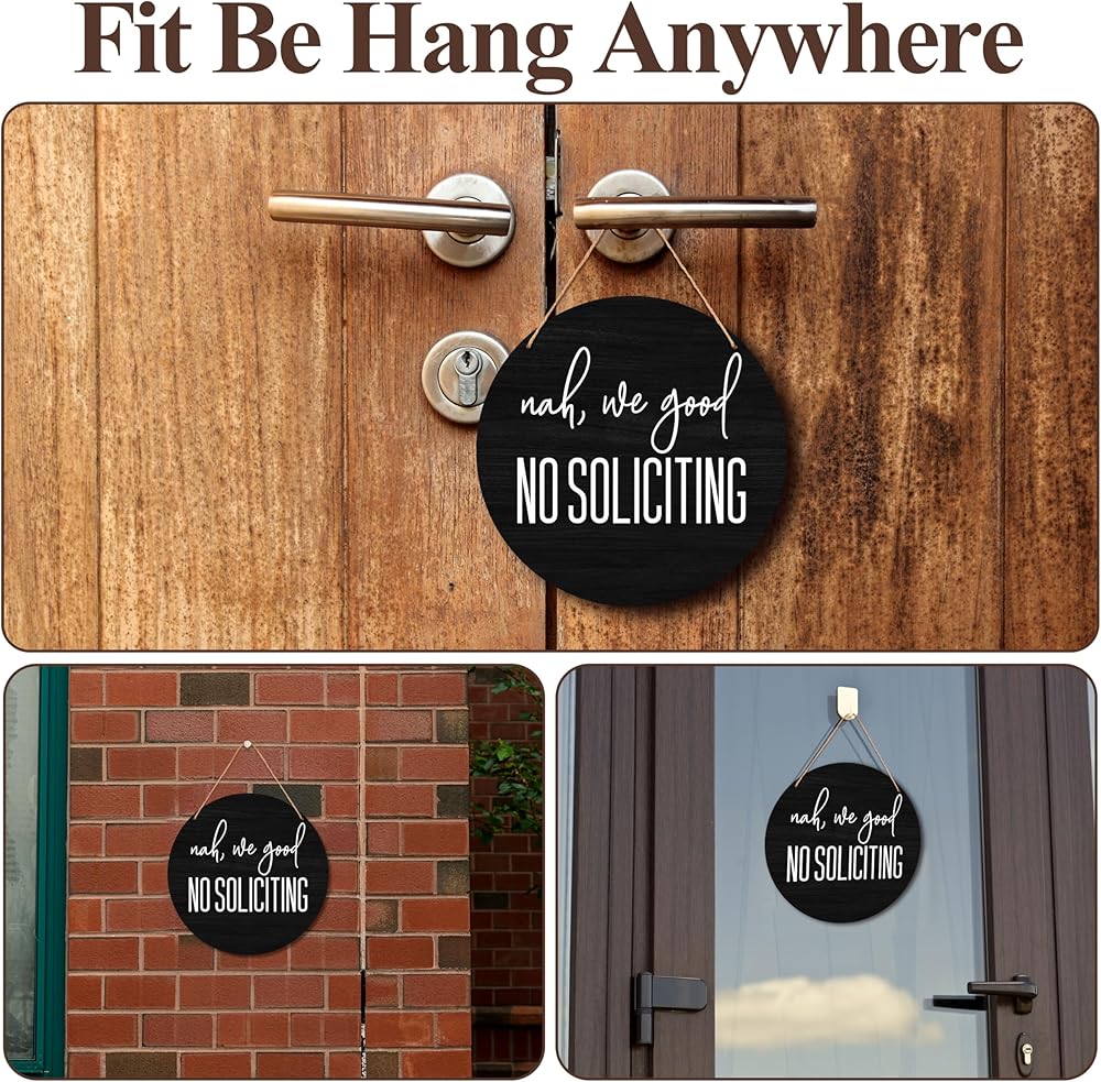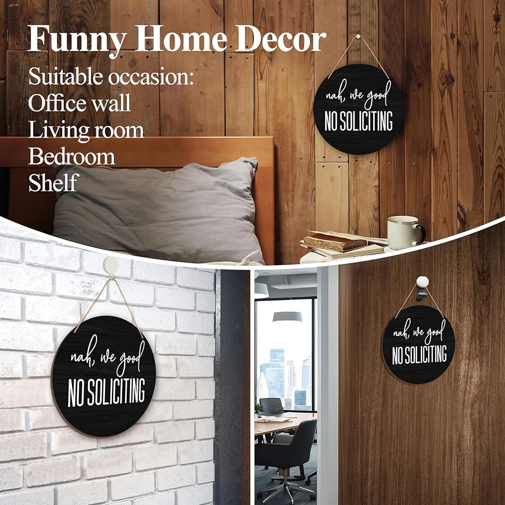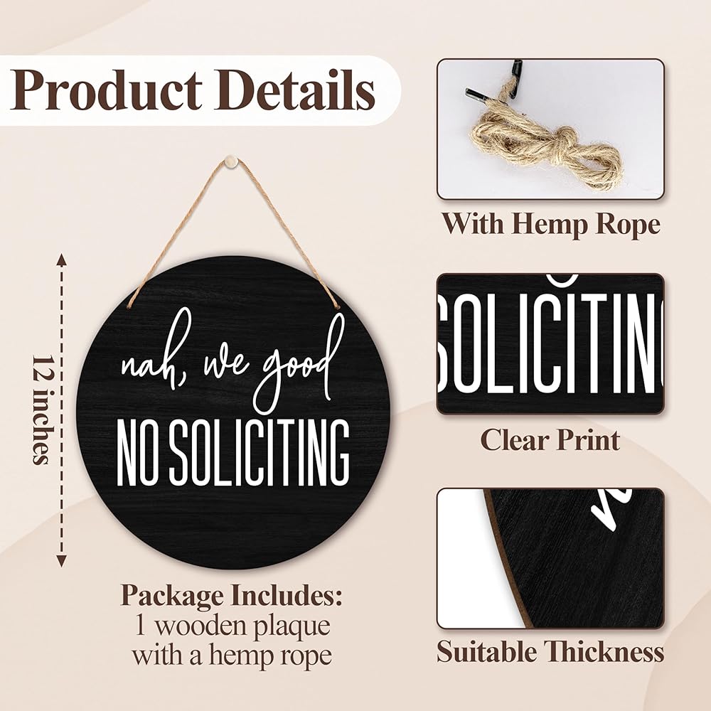 Suitable Size: Our no soliciting sign measures 30x30 cm/12x12 inches with a jute rope, the right size is perfect for hanging on indoor and outdoor walls, doors and anywhere you want to keep unwanted solicitors away from bothering you. High-quality Material: This home front wooden sign is made of high quality wooden material, and compiled hanging rope, which makes it superior durability, fine workmanship, not easy to be deformed or broken, and can be decorated repeatedly for a long time. Funny Decoration: This no soliciting sign is suitable for indoor or outdoor, you can hang it on the front door, porch, window, wall, garden, backyard, etc., it can be a fun decorative piece while expressing that you don't want to be disturbed A Thoughtful Gifts: This no soliciting wooden sign is a great gift idea for your colleagues, friends, family, boss, etc for holidays or other special occasions, hang it on the door and they'll feel your thoughts as they enjoy the peace and quiet. Timeless Design: This round wooden sign features simple, eye-catching text, and a brightly coloured, beautifully detailed pattern, which is not only beautiful but also sturdy and durable, and will make a statement at first sight wherever it is hung.
