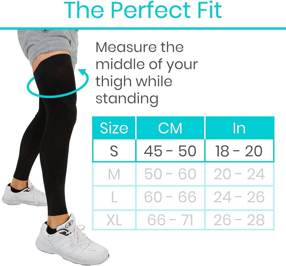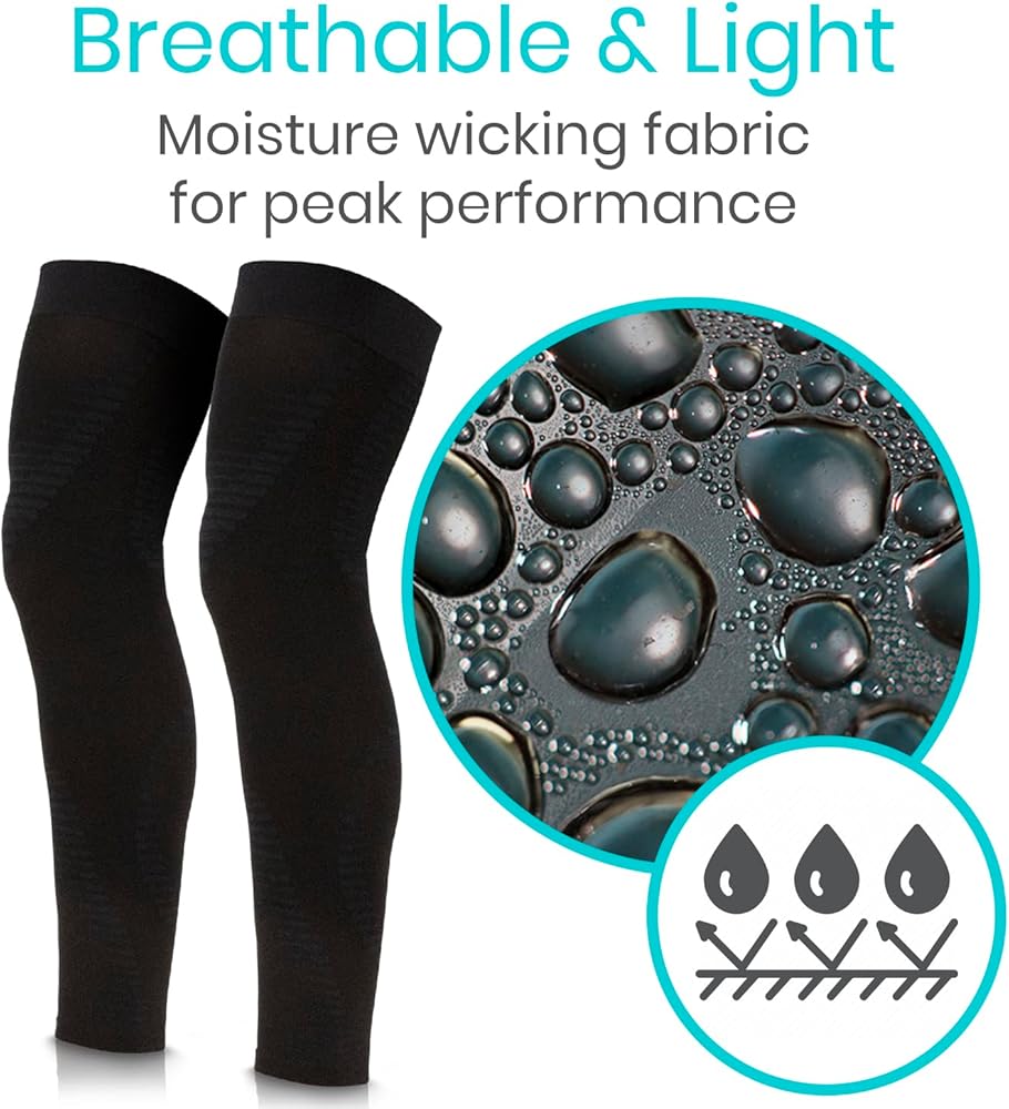 FULL-LENGTH LEG SUPPORT: Great for active individuals, the Vive Leg Compression Sleeves provide stabilizing support for the quadriceps, hamstrings, knees and calves. Alleviating soreness, stiffness and muscle fatigue, a pair of support sleeves is great for those on their feet all day and walking, running, working out or playing your favorite sports.