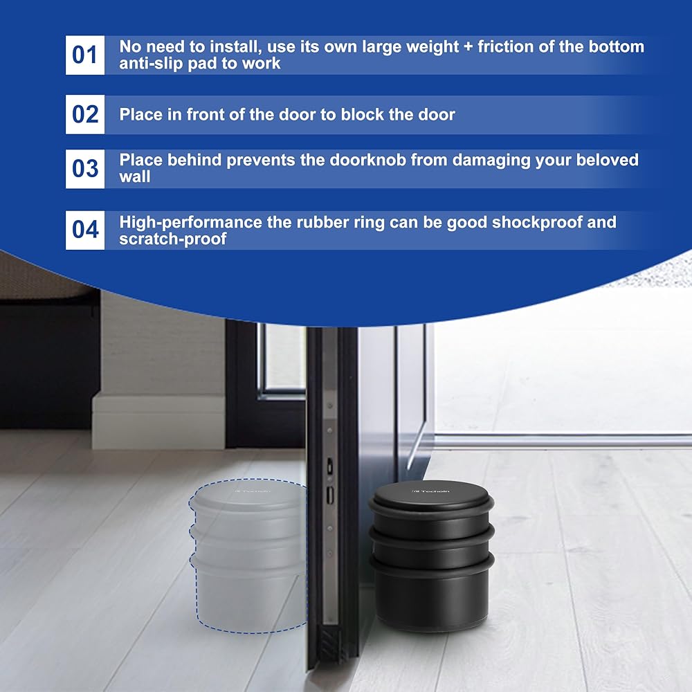 Multiple Locations, Two Uses - This heavy door stopper is ideal for living rooms, bathrooms, bedrooms, kitchens, offices, residential or commercial premises. You can choose to place it in front of or behind the door to avoid closing the door or prevent the doorknob from leaving marks on the wall.