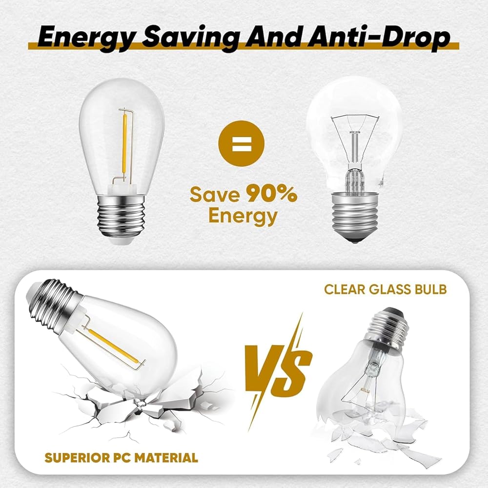 Indoor & Outdoor - These outdoor string light bulbs are made of high-quality waterproof PC shell, which can effectively prevent accelerated aging caused by ultraviolet, Shatterproof and Weatherproof, suitable for indoor/outdoor lighting use at -20 ℃~60 ℃, not easy to fragile.