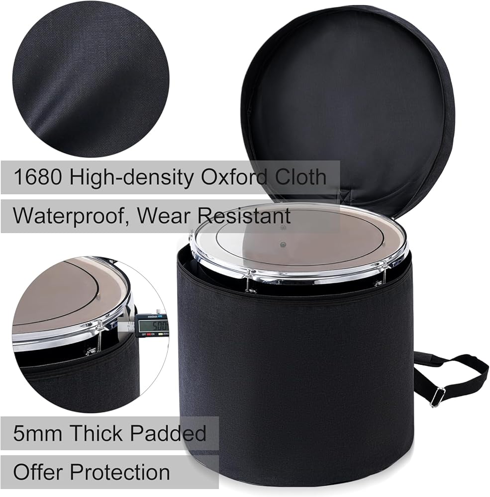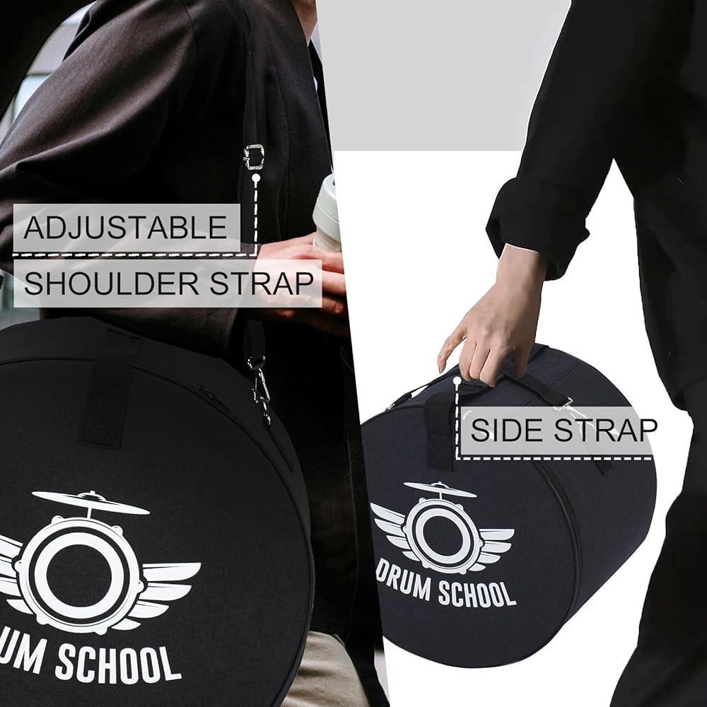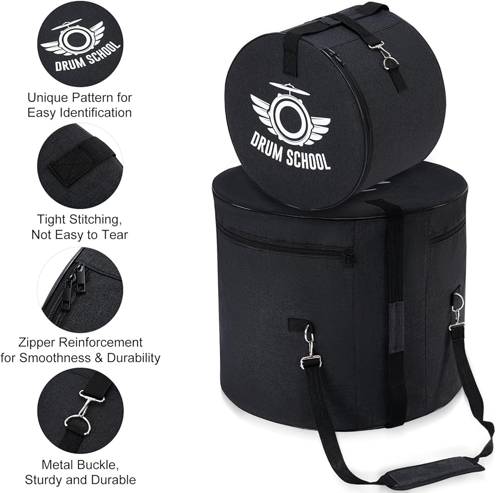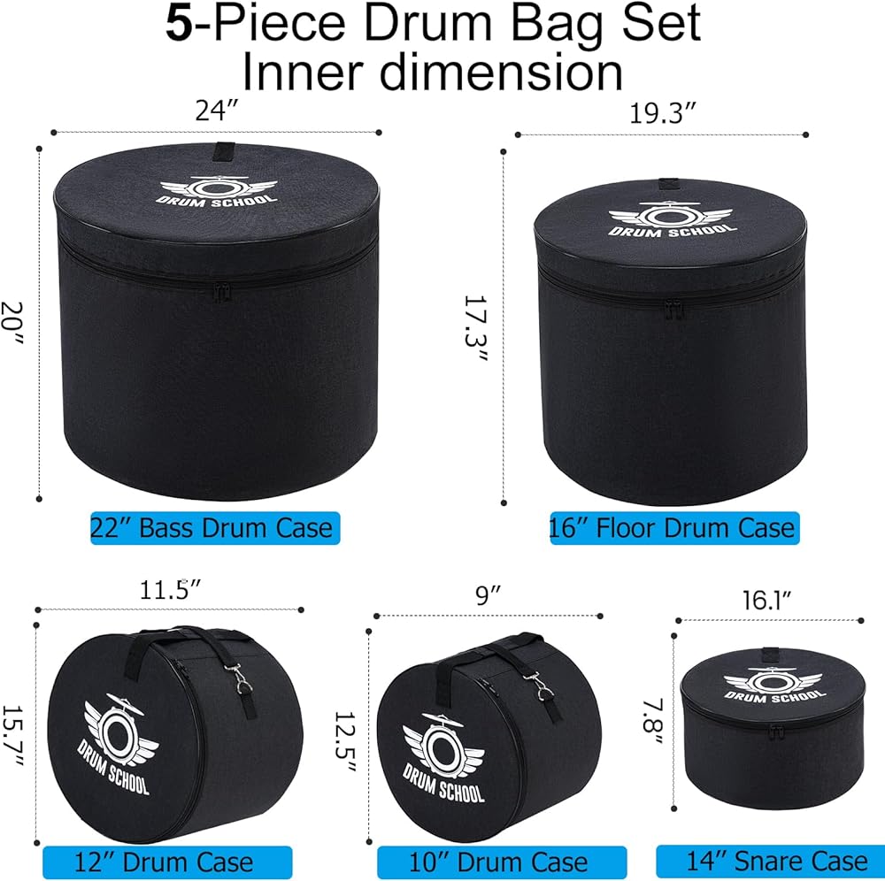 5PCS Drum Case Set: Package Includes: 12" Tom Bag, 13" Tom Bag, 14" Snare Drum Bag, 16" Floor Tom Bag, 22" Bass Drum Case. An additional 1-2cm width accommodates the differences in drum sizes of different brands, ensuring that your drum has enough space in the bag.