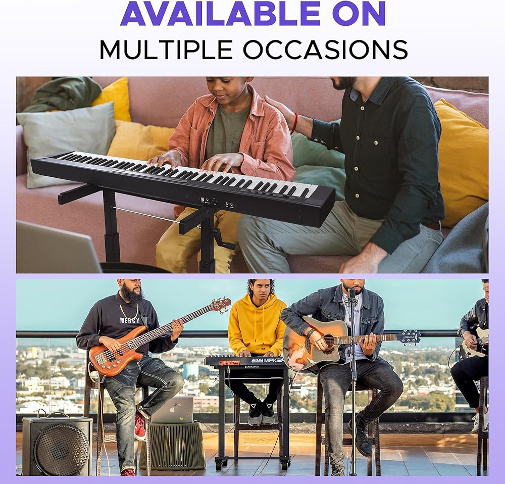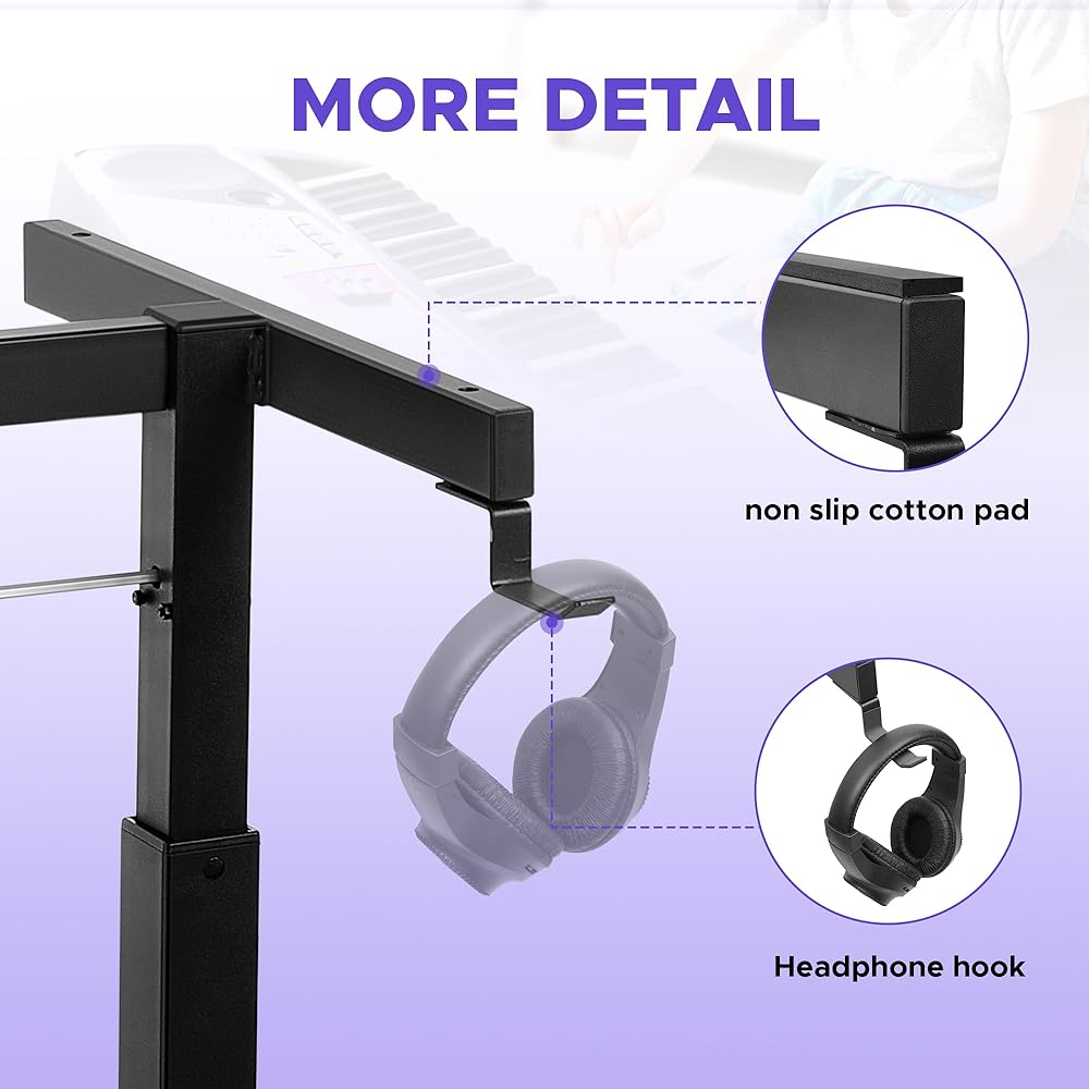 【صلب وموثوق: حامل لوحة مفاتيح البيانو عالي التحمل مصنوع من مادة معدنية بسمك 1.5 مم، والهيكل ثابت. يمكنه حمل ما يصل إلى 400 رطل مما يضع بأمان البيانو الكهربائي الأثقل وأجهزة المزج وغيرها من لوحة المفاتيح الرئيسية 61-88.