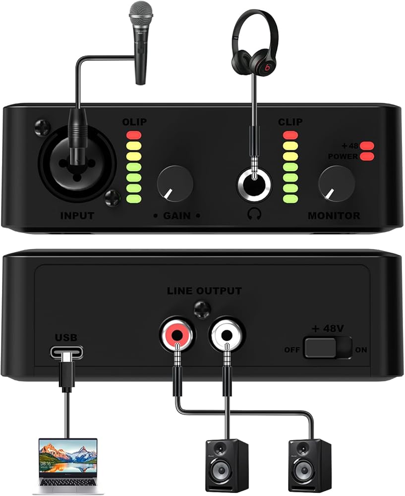 【متعددة الاستخدامات】تعد واجهة الصوت USB منتجًا مشهورًا وذو تقييم عالٍ، ويوفر طريقة بسيطة وفعالة لتوصيل جهاز الكمبيوتر الخاص بك بمعدات صوتية احترافية. إنه مصمم للموسيقيين ومقدمي البودكاست وفناني التسجيل الذين يحتاجون إلى واجهة صوتية موثوقة وعالية الجودة لتسجيل الموسيقى أو البودكاست الخاصة بهم.