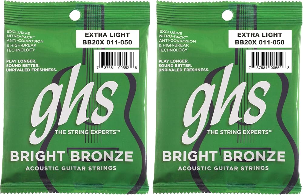 GHS Bright Bronze acoustic guitar strings boast a specially tempered 80/20 copper-zinc alloy wound over a hex core to deliver an extra-bright tone. This expertly designed core-to-cover ratio gives increased brightness & flexibility.Introducing our brand new NitroPack singles! Each single string is sealed in a nitrogen environment, eliminating all oxygen, in a tear-resistant package. Whether you use one string or the whole set, the NitroPack guarantees straight from the factory freshness!ABOUT GHS STRINGSGHS Strings are manufactured in a state-of-the-art, climate controlled facility using precision equipment and only the purest of materials. The air-tight Fresh Pack locks in factory freshness that endures the test of time and locks out corrosion. When you buy GHS strings you get quality, consistency, lasting intonation and superbly harmonious sound! GHS Strings - The String Specialists since 1964.BB30L Set: 012-016-BB24-BB32-BB42-BB54