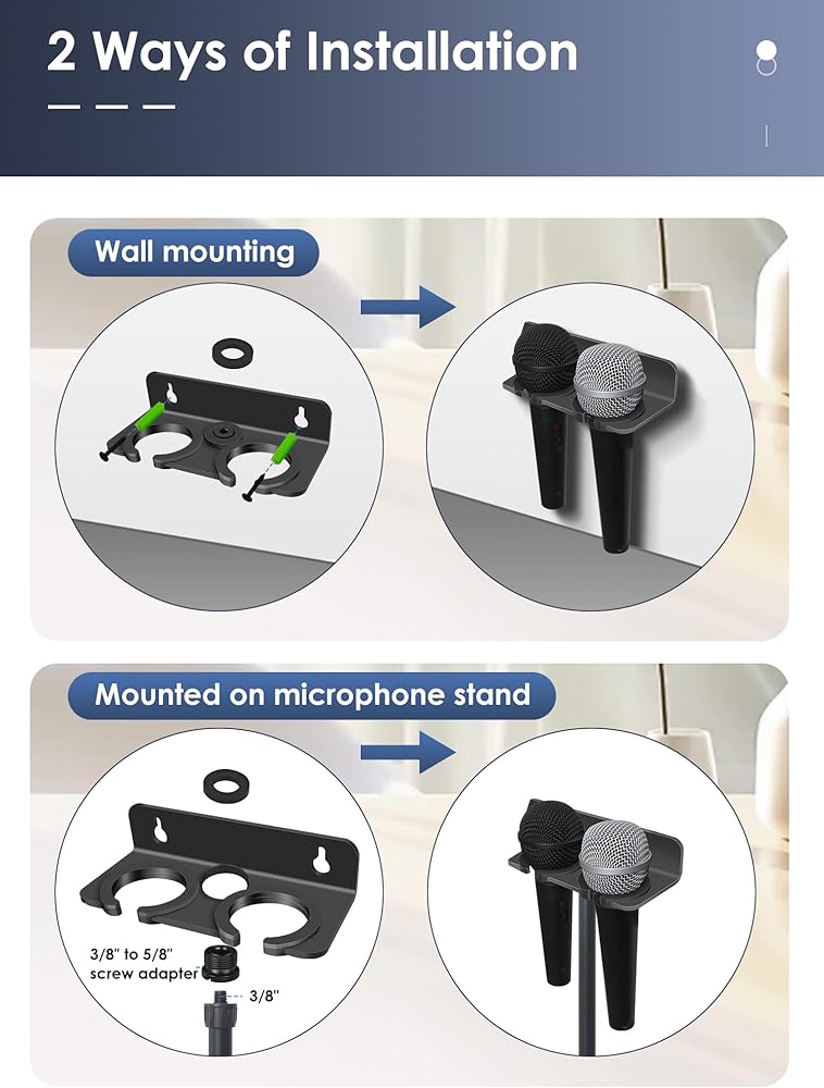 【Easy Installation and Compatibility】5/8"-27 threaded center socket and an included 3/8"-16 threaded adapter enables mounting the mic holder on a wide range of standard US and European mic stands. You can also mount the microphone stand to a wall with the included screws. Effectively reduces the clutter of wires on the stage and frees up stage space.
