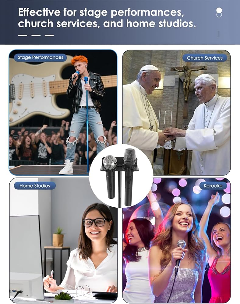 【Upgraded Multi-Mic Holder】This multi microphone holder is the ideal solution for performances, home studios, churches, or professional recording setups. It can securely hold up to four handheld microphones, whether they are dynamic, wired, or wireless, making it perfect for musicians, church services, DJs, and karaoke enthusiasts.(Note: Mic Stand not included.)