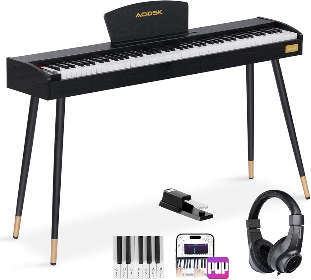 AODSK Beginner Digital Piano 88 Key Keyboard,Full-size Electric Piano for Beginners,with Sheet Music Stand,Pedal,Power Adapter,Headphone Mode,USB-MIDI,Piano Lessons,Black,-Comes with headphones