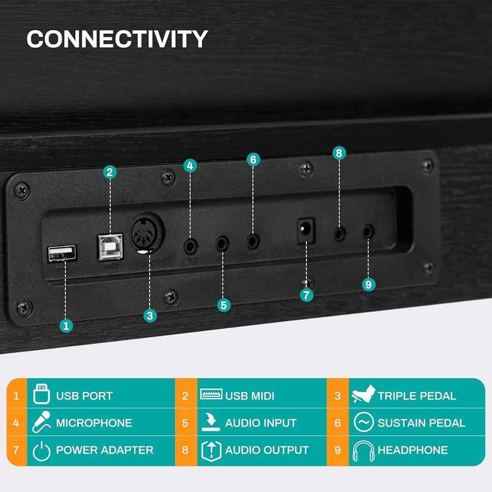 【Smart Connectivity】Comes with 1/4" audio output port for amplifiers,speakers,stereo and recording devices,mixing consoles;1/4" audio input port for amplifiers,smart phones,MP3s or CD players;USB MIDI port;