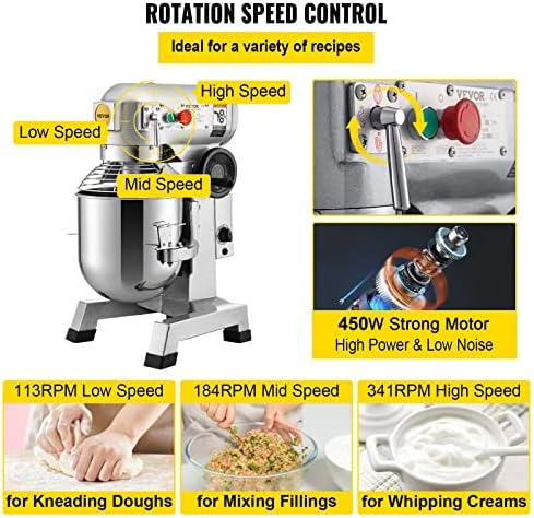 Versatile Machine: Our commercial stand mixer is equipped with 3 stirrers, including a dough hook, a flat beater, and a wire whip. The dough hook is used for smoother mixer operation and is ideal for pizza and other heavy dough. The flat beater is suitable for mashing potatoes or vegetables, mixing cakes, batters, or icing. The wire whip is widely applied in aerating light mixes such as whipped cream, egg white. These considerate accessories help you achieve the results you need for any recipe.