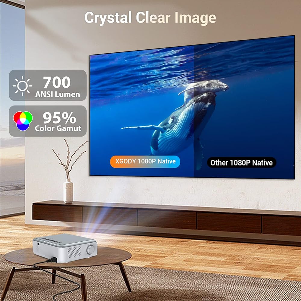 【Native 1080P Home Theater Projector 4K Support】 XGODY Sail 1 full HD projector has a native 1920 x 1080P resolution and 15000:1 high contrast ratio. The 50%-100% zoom function and 4D ± 50°keystone correction function keep movie projector image clear, horizontal and vertical. Create a home theater experience for you. You can enjoy video fun anytime without additional media players. Built-in 5W HiFi speaker, Video projector provide a great auditory sense experience without external speakers.