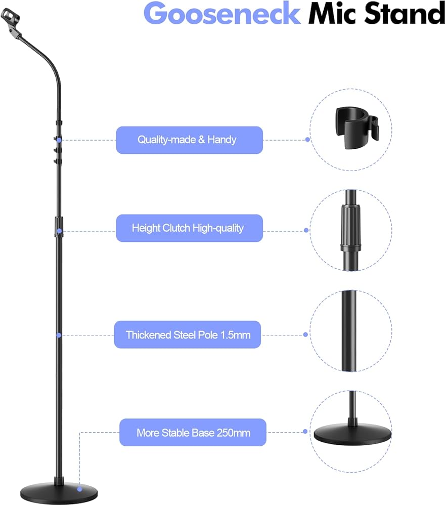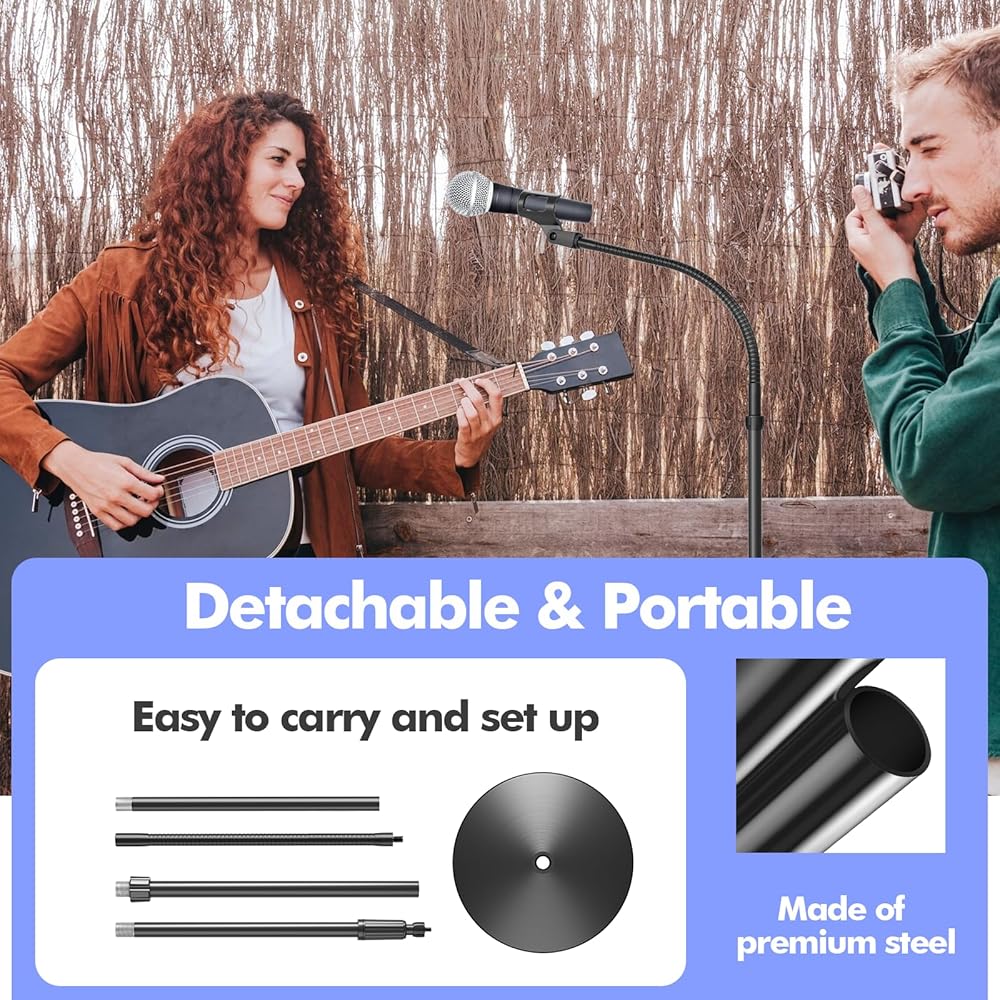 DETACHABLE AND PORTABLE STAND: This gooseneck floor stand can be disassembled into four parts in seconds, and its highly portable and easy to set up is perfect for musicians who are always on the go. In addition, it is compact and durable for long-term use. Perfect microphone stands positioning and optimal pickup for studio and concert performances