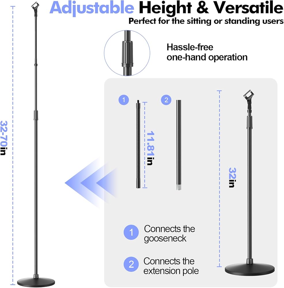 HEIGHT ADJUSTABLE AND STABLE: The microphone stand can be adjusted from 32 inches to 70 inches in height with the adjustment knob for standing or sitting.Compared to other stands on the market that use three height clutches, this stand uses only one height clutch and a separate extension bar for quicker and easier adjustment to your desired height, which is attached via a long screw adapter for added stability.