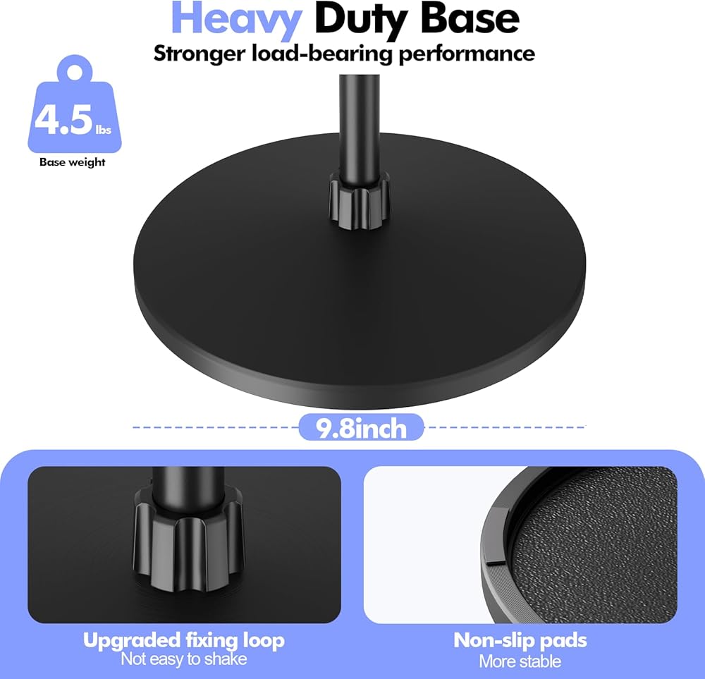 HEAVY DUTY ROUND BASE: Unlike other tripods, our mic stand comes with a weighted round base that is 9.8 inches in diameter and weighs 4.5 pounds, which is more stable and has a higher weight capacity. There are 6 non-slip pads on the bottom of the base to provide extra stability. An upgraded retaining ring has been added to the base where it attaches to the center boom stand to further enhance stability, prevent wobbling, and provide reliable support for your equipment.