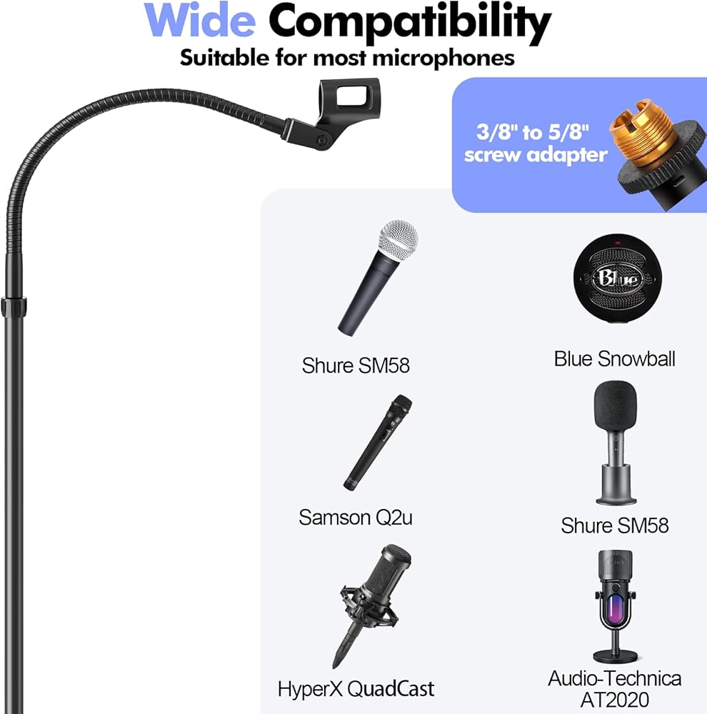 WIDE COMPATIBILITY: This upgraded weighted base microphone stand straight is suitable for most types of microphones, such as HyperX QuadCast, Fifine K669B (Attention: Shock mount not included), Blue Yeti, Blue Snowball iCE, Audio-Technica AT2020, Audio-Technica AT2035, Razer Seiren X, Samson Q2U, Shure SM58, Shure PGA48, Shure SM7B and so on. No matter which microphone you choose, this stand has you covered.