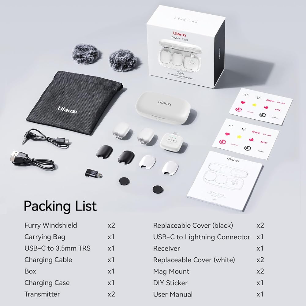 ULANZI A30 Tiny Mic Magnetic (White), Wireless Lavalier Microphone Mini Size, Noise Cancellation, 164 ft Range, 20H Battery Life, Lapel Microphone for Video Recording, DSLR, iPhones, Android, PC