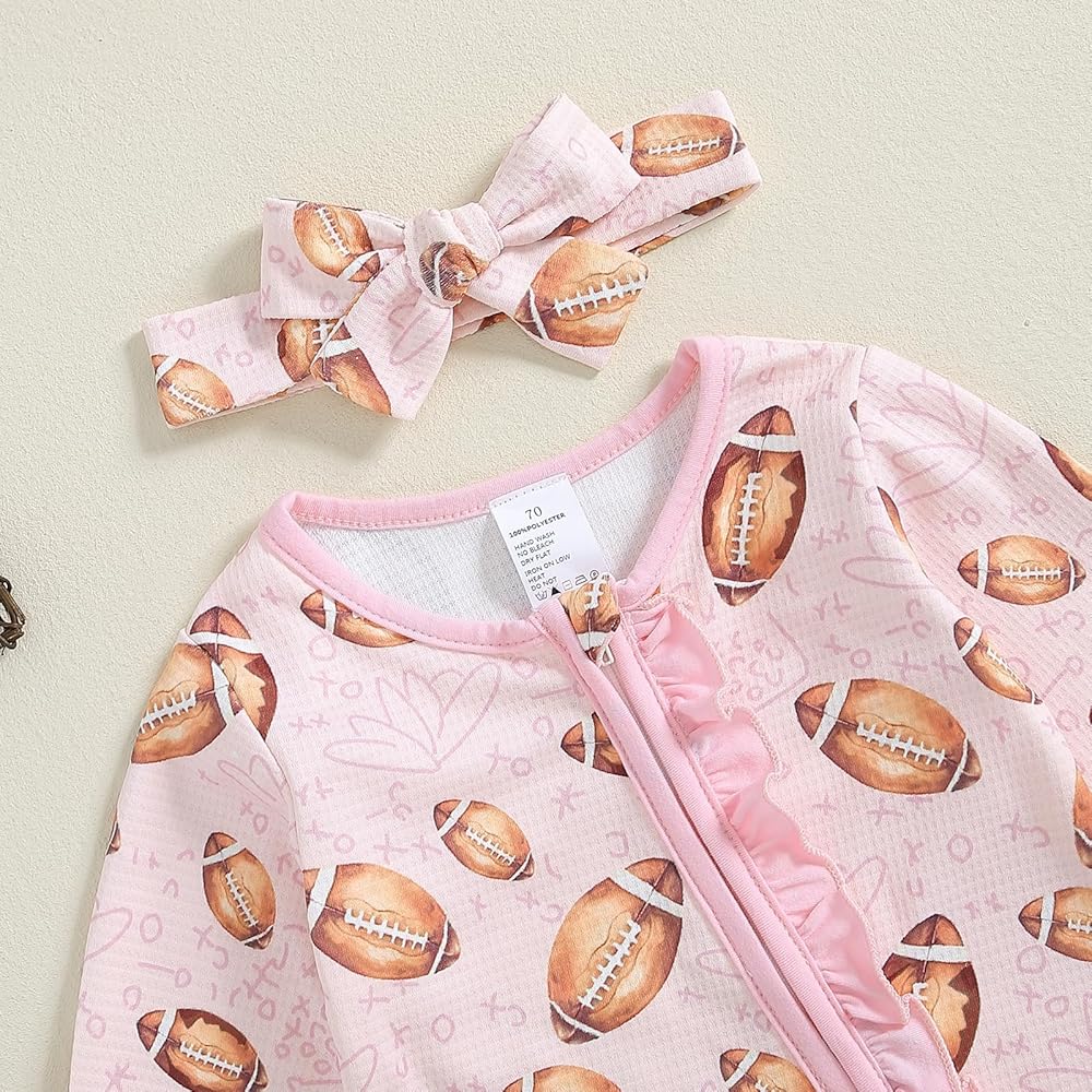 【Design】Newborn baby girl football footie,it features an allover rugby print with a playful twist,the zip-front closure makes for easy dressing and diaper changes.Complete with a matching headband, this charming outfit is perfect for playtime, naptime, or any time.