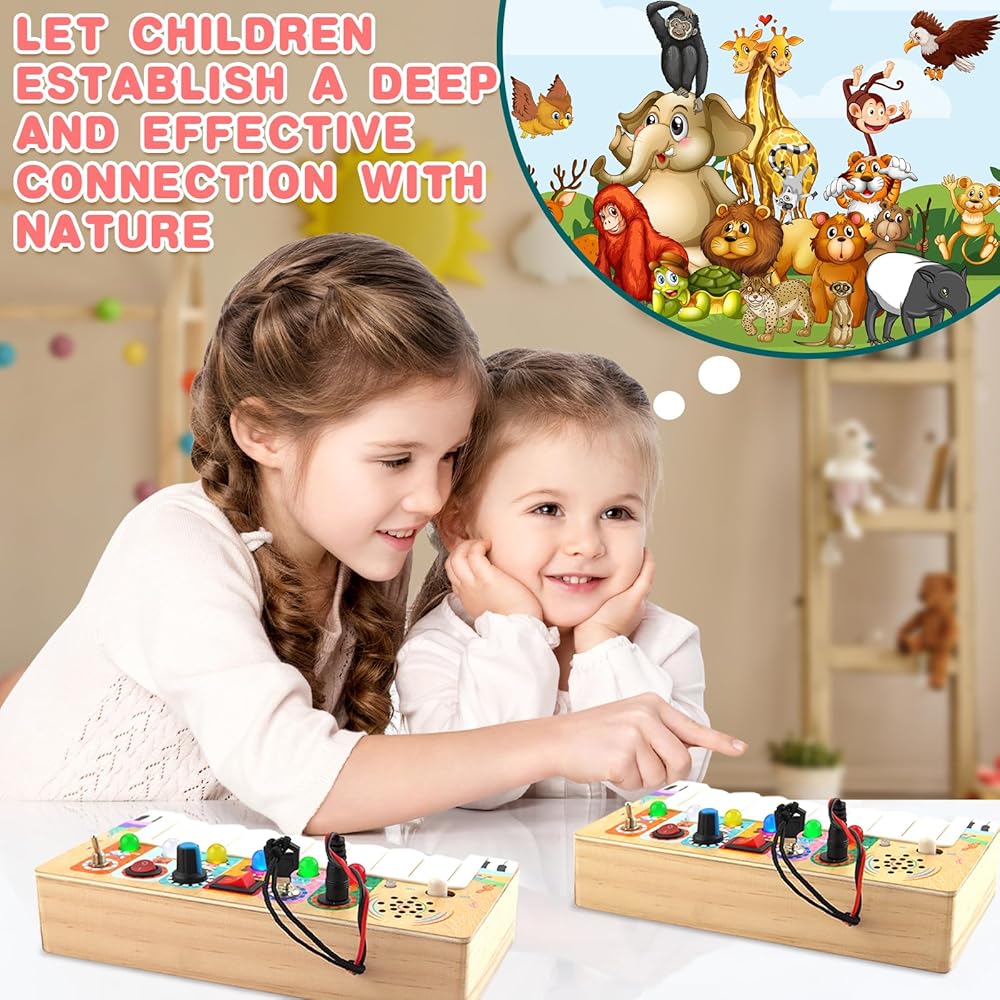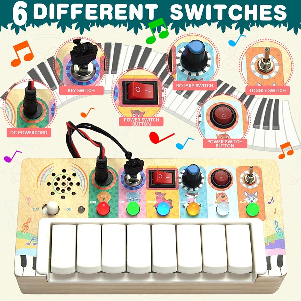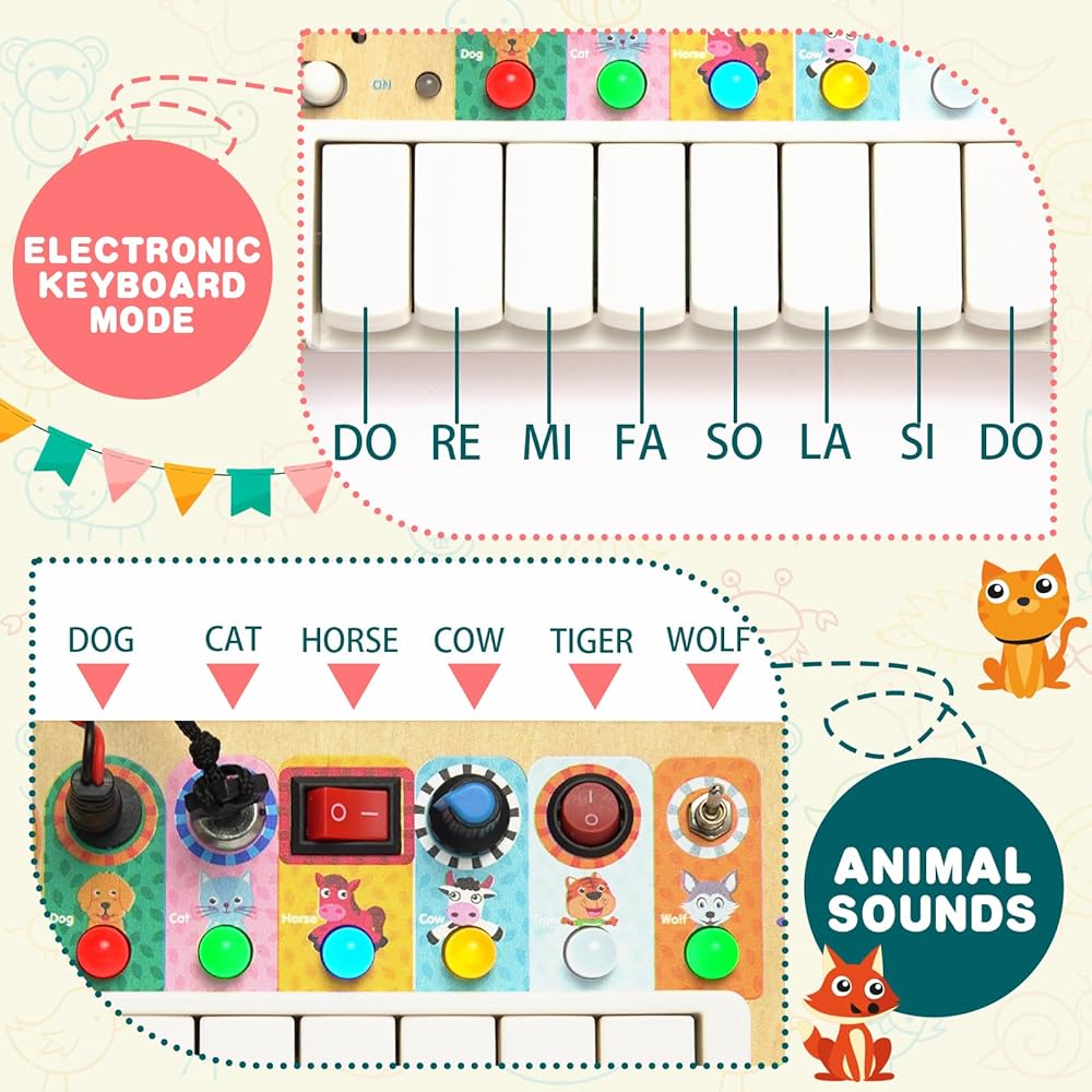 Learning Experience: This busy board is equipped with 8 piano keys, 6 LED lights and 6 different animal sounds, allowing toddlers to identify different animal sounds while playing, and create their favorite music through the piano keys, improving children's musical sense and hearing development