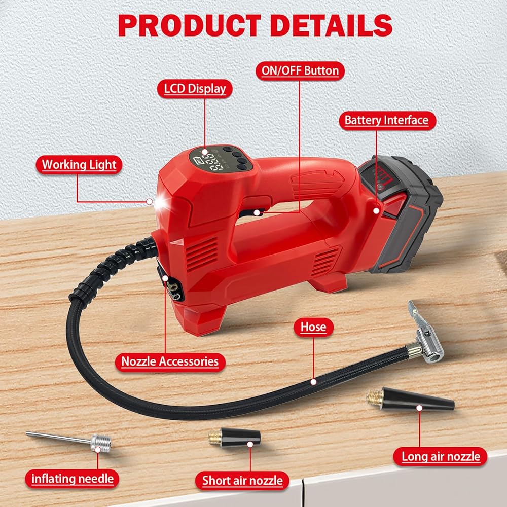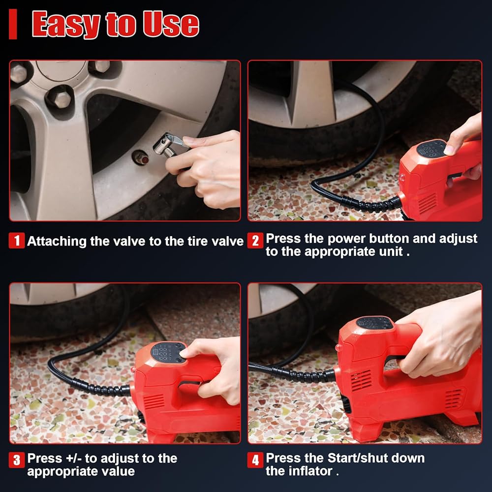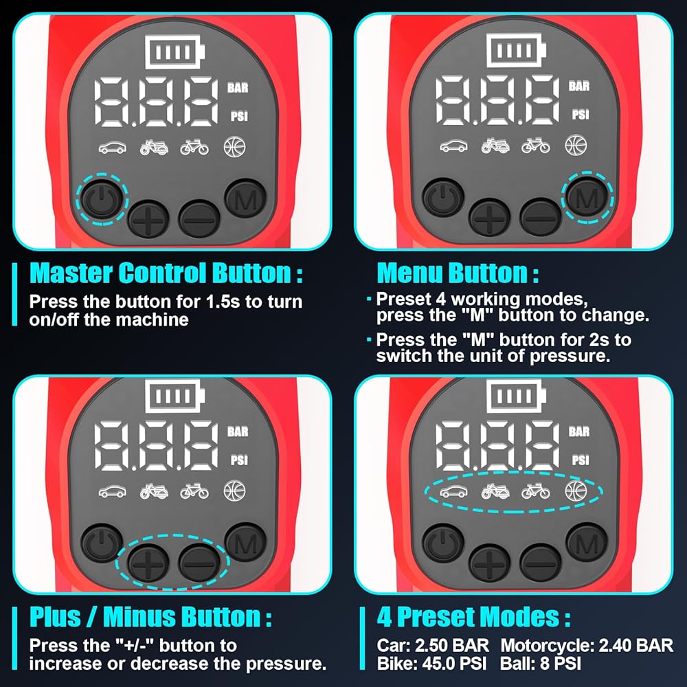 【BIGGER LCD PRESENT MORE】Tire pump include the bigger digital gauge will display both the desired tire pressure value and the current tire pressure and Low battery reminder. The unit of air pressure bar, kPa,Kg and PSI.Air pump for inflatables are four preset modes for you to choose from: car, motorcycle, bicycle, basketball. Note: not suitable for large truck tires.