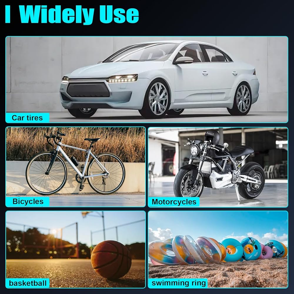 【AUTOMATIC SHUT OFF】Car air pump provides auto shut-off function. The air compressor for car will shut off automatically at the desired level, no over inflating. The accuracy of the indicated pressure is +/- 0.5 PSI. The bike pump Comes with 3 nozzles, bike tire pump fit for Automotive, SUVs, cars, motors,basketball,inflatable pool toys etc.