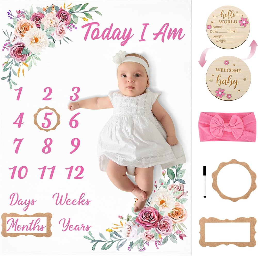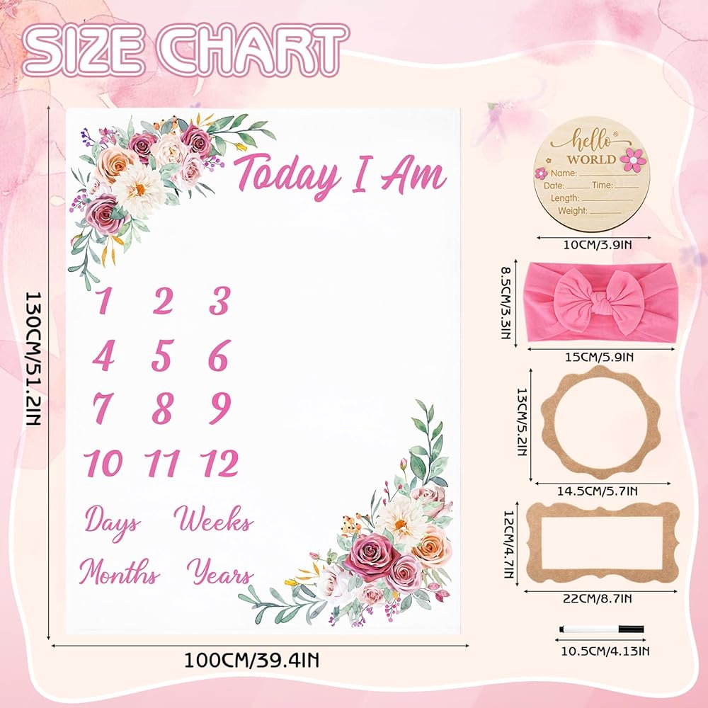 【Package Include】The package includes 1 x floral baby milestone blanket, 1 x double sided milestone signs, 1 x pen, 1x pink headband, 2 x felt frames, that used to record your baby's growth and leave precious memories.