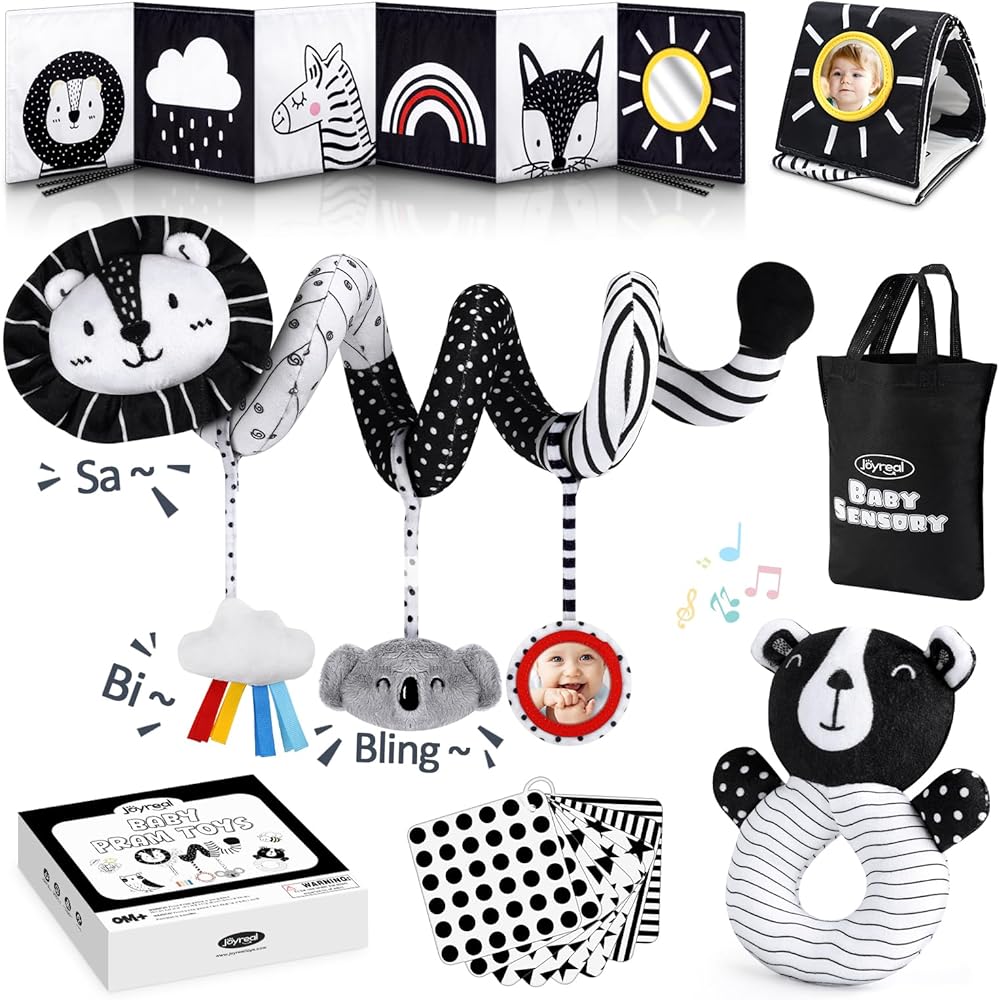 Joyreal High Contrast Baby Toys for Newborn, Black and White Baby Sensory Toys with Car Seat Toys,Infant Toys with Black White Cards Book, Montessori Toys for Baby Gifts