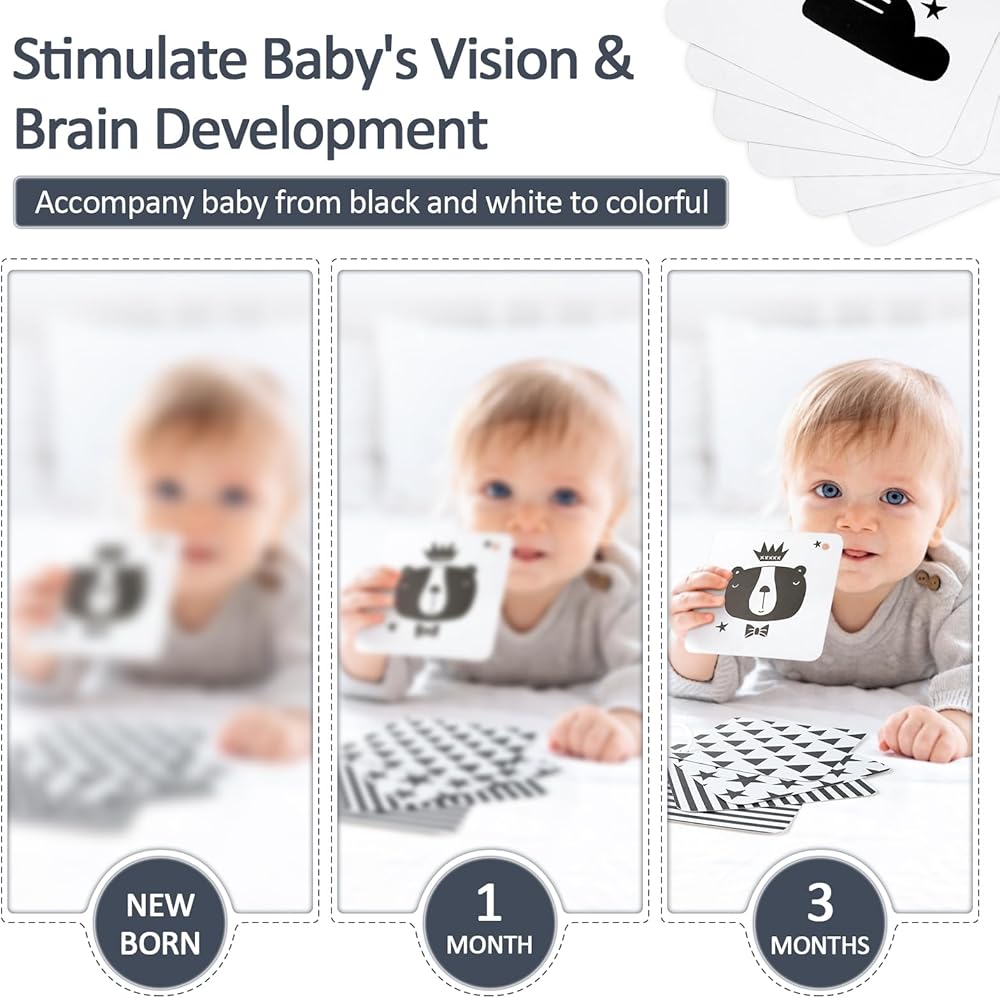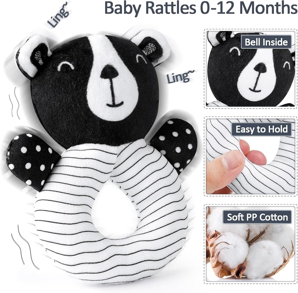[High Contrast Baby Toys] Our baby sensory toys sets include 1 car seat toy, 1 bear rattle toy, 1 black and white baby book, 8 high contrast baby cards and storage bag.