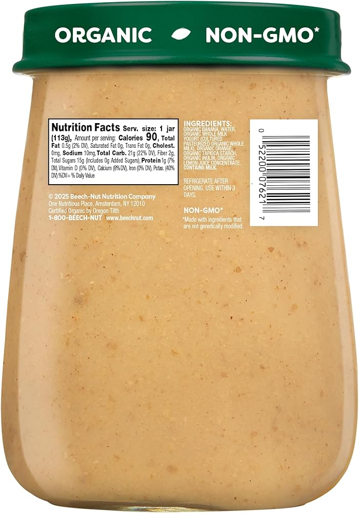 MADE WITH SIMPLE ORGANIC INGREDIENTS: Beech-Nut Organics baby food is made with real organic banana, orange & whole-milk yogurt cooked over indirect heat to preserve color, flavor and nutrients.