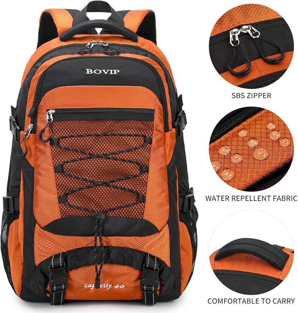 Water Resistant & DURABLE: Made of Water Resistant high-density polyester material. BOVIP camping backpack is made of extra thick, tear-resistant, water-resistant and anti-abrasion polyester fiber. All stress points are reinforced with bar tacking to increase its longevity.