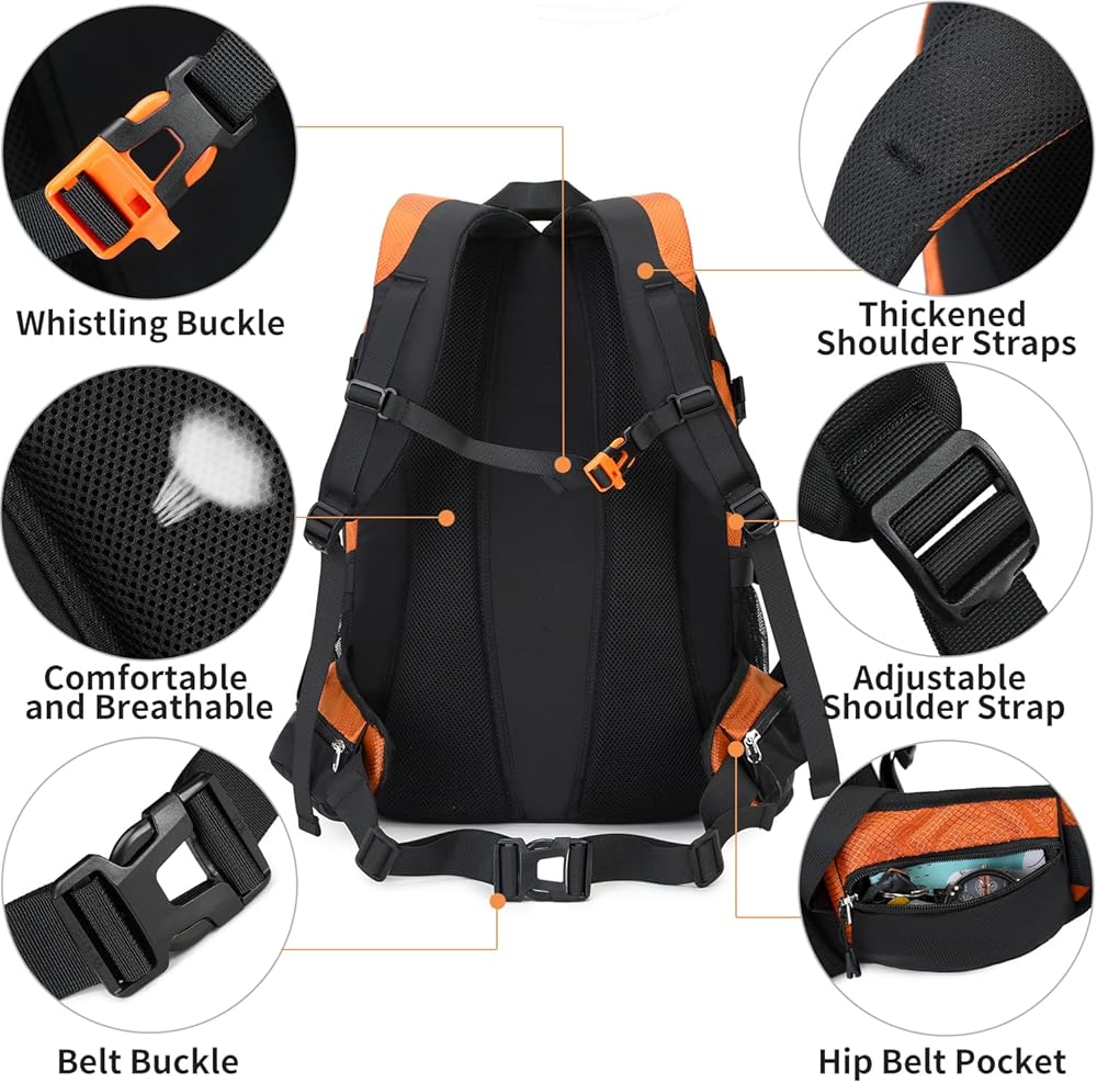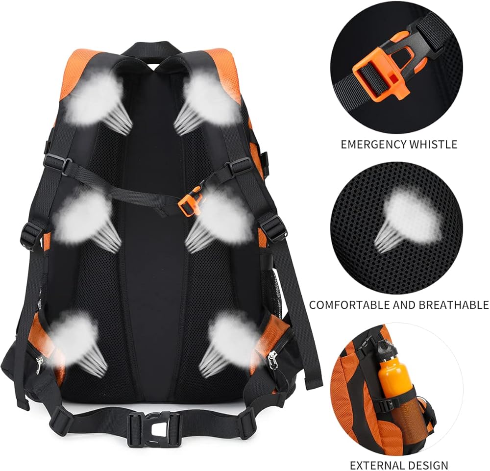 Breathable Mesh Padding and Whistle : For passionate hikers or trekkers, it with the ventilated mesh padding shoulder straps and backside, breathable system and lightweight design are the perfect hiking backpack for outdoor sports. Ergonomically designed provides body comfort even when pack is completely full. Keep it cool even in summer.