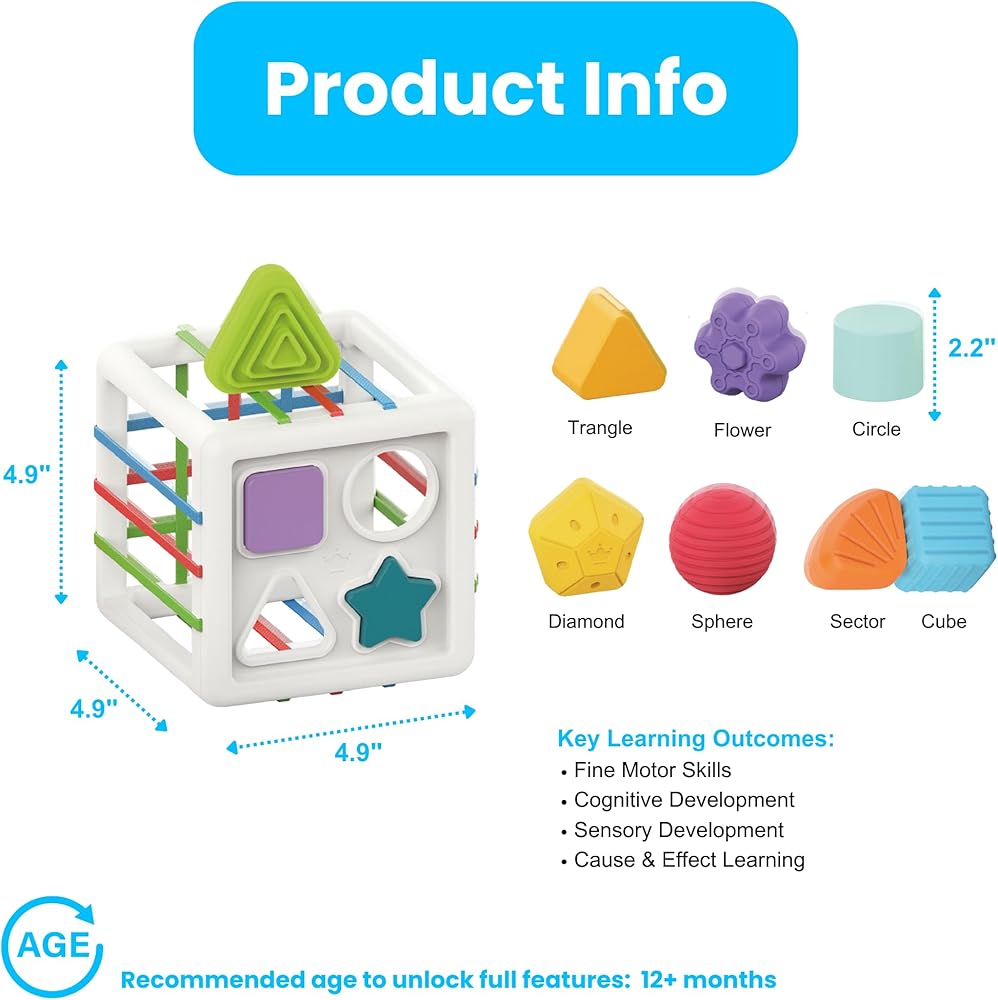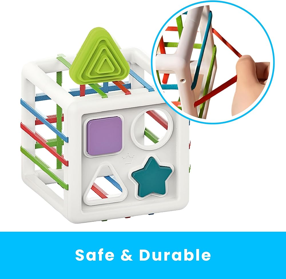 7-in-1 Activity Cube for Toddlers: This multifunctional toy includes a shape sorter, abacus, xylophone, spinning wheel, slides, gears, and an elastic band area for placing shapes and blocks. Each side offers a unique and engaging activity designed to keep toddlers entertained for hours.