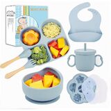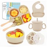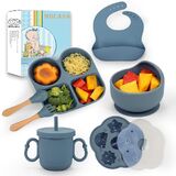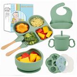 Terrific Training Tableware: Help baby learn how to eat and drink without help. Our baby eating set includes one suction plate, one suction bowl with lid, one adjustable silicone bib, one drinking cup with straw and lid, one spoon, one fork and one fabric bib. Perfect for baby led weaning, this set provides a safe and convenient solution for feeding babies 6-12 months+