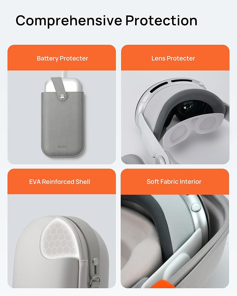 Premium Protection for Vision Pro: Built with durable EVA material, SODI Vision Pro case offers reliable splash-proof, shockproof, and dustproof protection. The waterproof zipper adds extra security against moisture, while soft inner padding shields your Vision Pro from scratches and impacts, ensuring long-lasting protection during travel and daily use