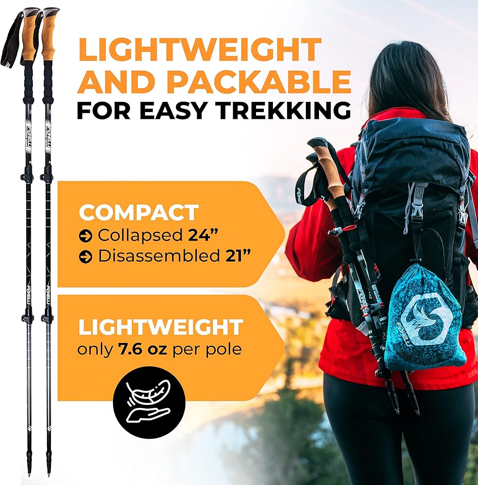Foxelli Carbon Fiber Trekking Poles – Lightweight Collapsible Hiking Poles with Cork Grips, Quick Flip Locks & All-Terrain Accessories – Adjustable Height Hiking Sticks for Men & Women