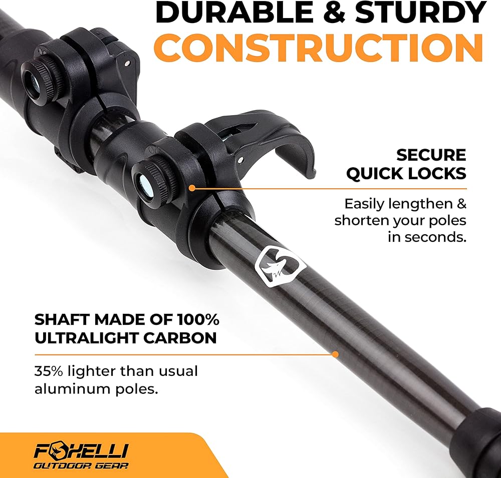 100% CARBON FIBER: Foxelli Trekking Poles (also known as Nordic walking poles or hiking sticks) are made from 100% carbon fiber material, which is known for its incredible lightness. Each pole weighs only 7.6 oz, allowing you to move quicker and faster while exerting less energy. Carbon fiber is also shock-absorbent and significantly minimizes the impact on joints. Durable and sturdy, these walking sticks are designed to withstand even the most challenging hikes or backpacking trips.