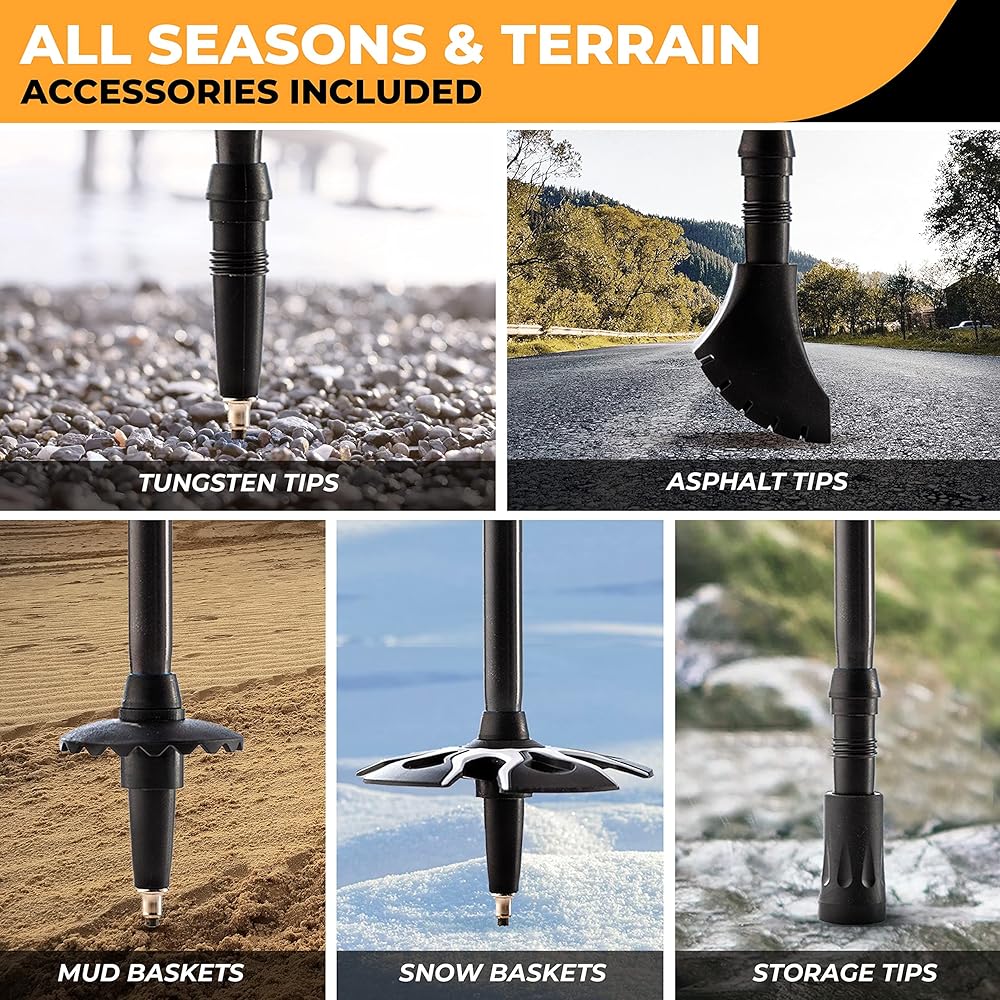 SUITABLE FOR ALL CONDITIONS: From challenging ice mountain climbing to casual strolling around the neighborhood - our included heavy-duty accessories and tungsten carbide tips will not let you down, whatever the terrain or the season may be. Thermoplastic rubber tips & baskets strongly attach to the trekking sticks, so you can forget about losing them on snowy or muddy trails. A carrying case and a carrying clip are both included for easy, convenient storage and transportation.
