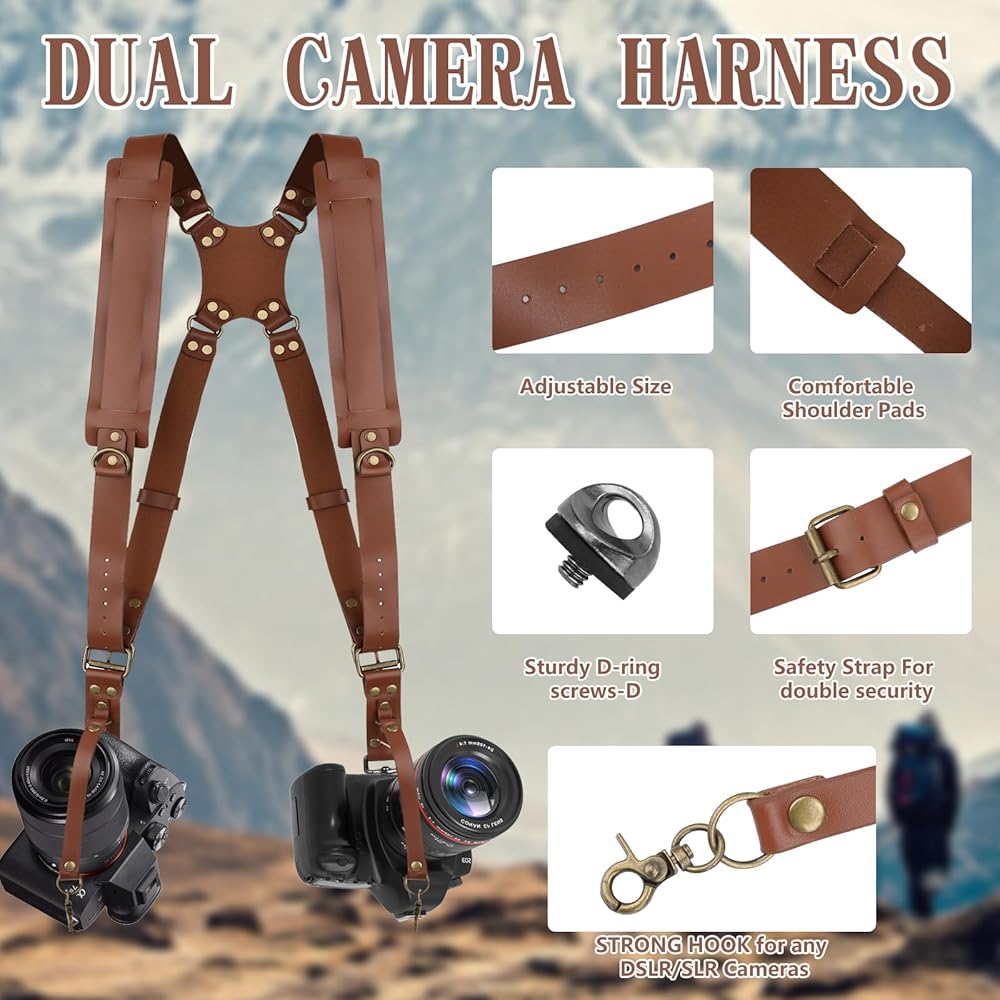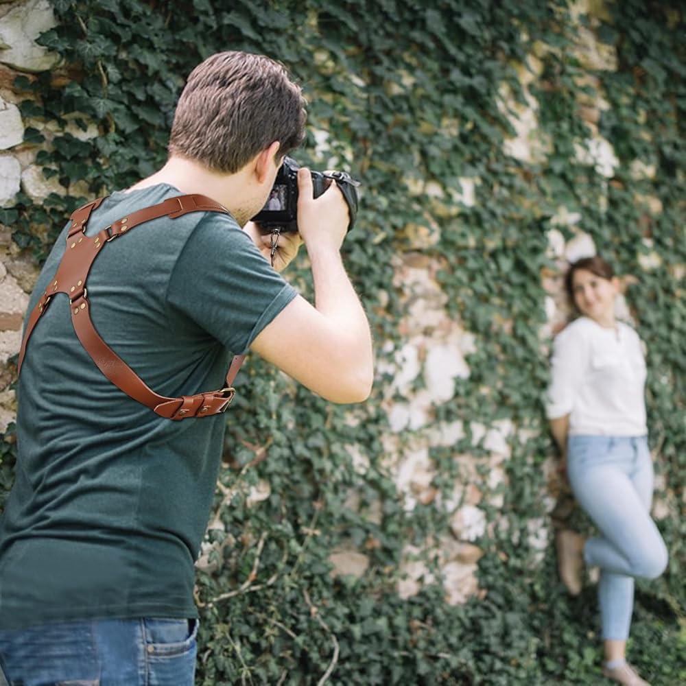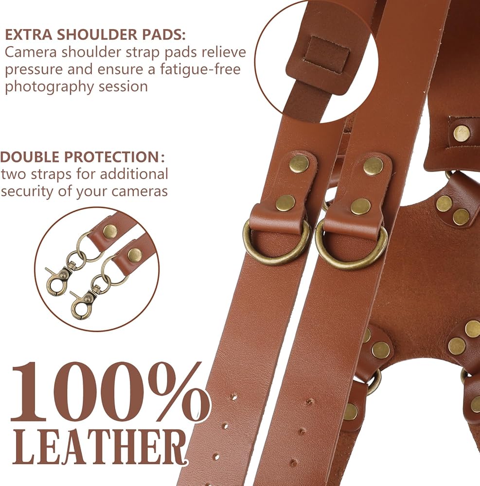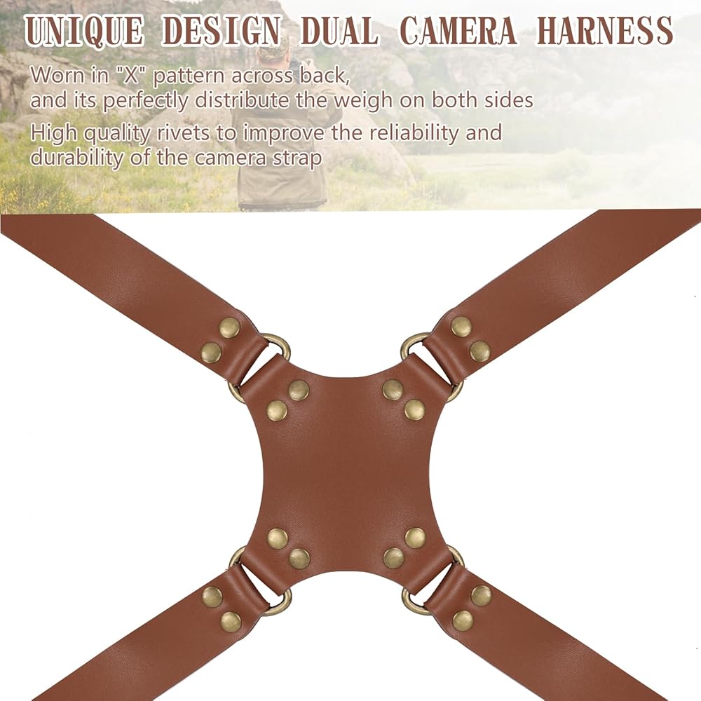 UNIQUE DESIGN DOUBLE CAMERA HARNESS— The "X" pattern on the back perfectly distributes the weight on both sides, with strong leather stitching for durability