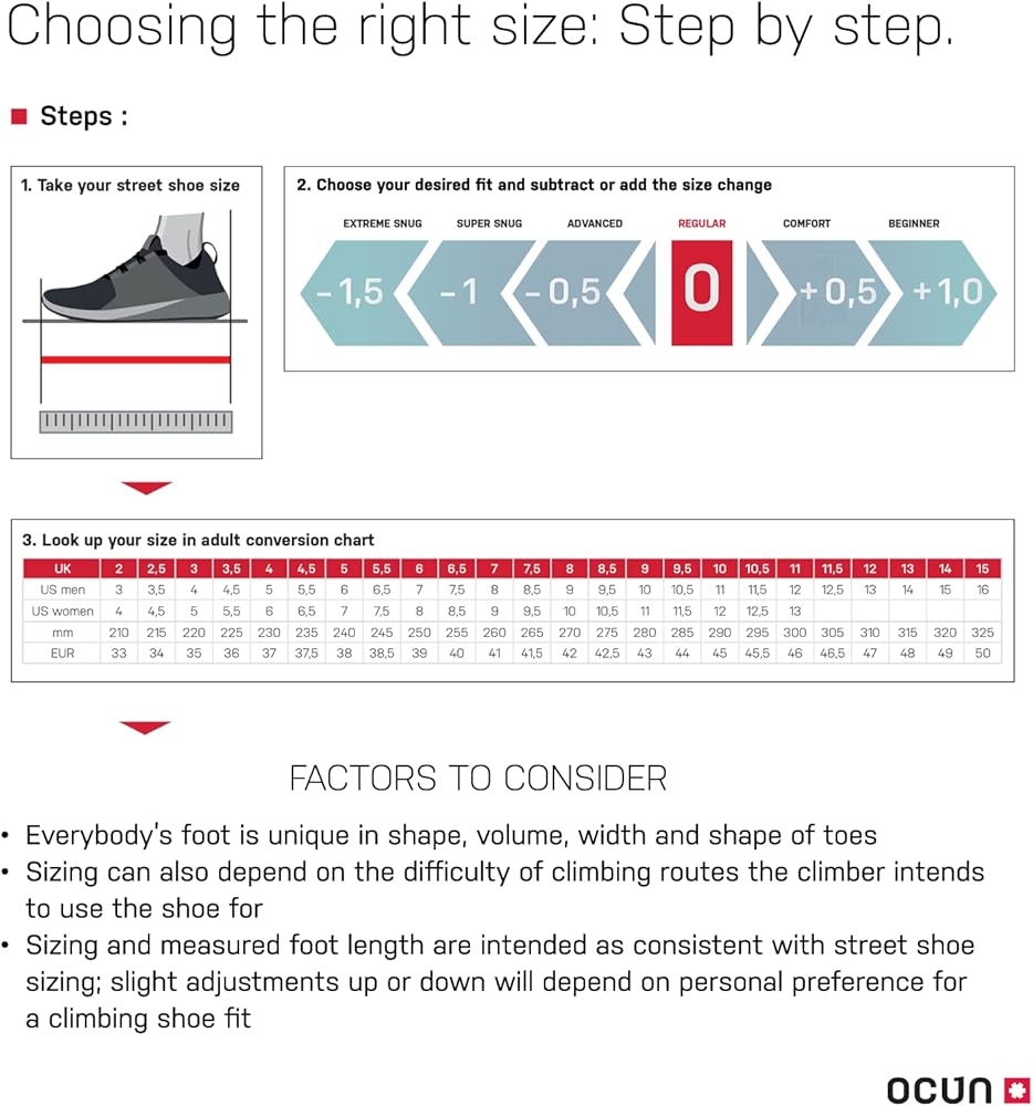 FIT: Striker QC is intended to fit to most foot shapes comfortably with a neutral profile and more generous big toe power point. The relaxed heel allows for the foot to fit flat and comfortably in the shoe with room for less stressed toes. Ocun shoes are designed for a performance fit at or near street shoe size, most climbers find this shoe fits as intended at street shoe size or +/- 1/2 size based on personal preference.