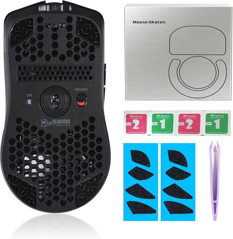 The product is suitable for Glorious Model O / Model O-(Minus) / O 2 wired and wireless models mouse. Contents include: 2 Sets Mouse skates + tweezers + Cleaning tools