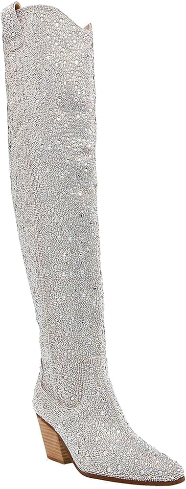 Decoration: The high boots are decorated with sparkling rhinestones on the pointed toe, block heel and cuff, adding a touch of sophistication and glamour to any outfit