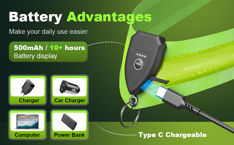 【10+ Hours Battery Life, USB-C Charging】- The reflective running gear features rechargeable LED lights with 10+ hours of battery life.This reflective gear comes with a USB-C charging port and a battery display function and supports fast charging, making it convenient to use and providing peace of mind during nighttime activities.