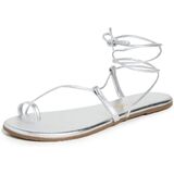 Dress up wearing the TKEES Jo sandals that look chic and feel comfortable. Leather upper, lining, and insole. Wrap around ankle tie closure. Open round toe. Flat silhouette. Rubber sole. Made in Brazil.