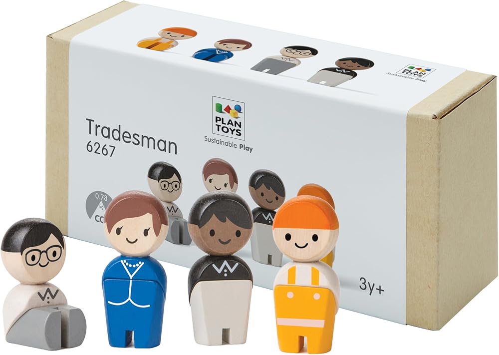- Four gender-neutral wooden people dressed as tradesmen