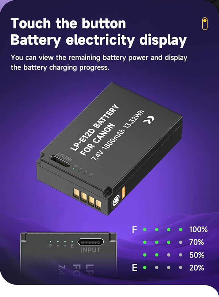 【HIGH CAPACITY】Enjoy extended video recording and more photo shoots with 1800mAh high capacity LP-E12 batteries.Always have power on hand by carrying 2 backup batteries for emergencies.