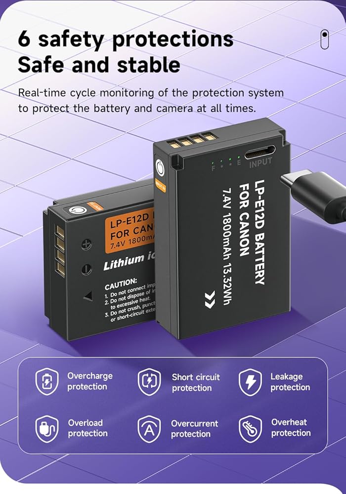 【Reliable Safety】The LP-E12 rechargeable lithium-ion battery pack has obtained FCC, CE, UL, CUL, ETL, and GS certifications, ensuring top-notch safety standards for your devices. The battery pack incorporates advanced safety features such as Over-Heated, Over-Charge, Over-Voltage, and Short-Circuit protection, guaranteeing optimal performance and protection.